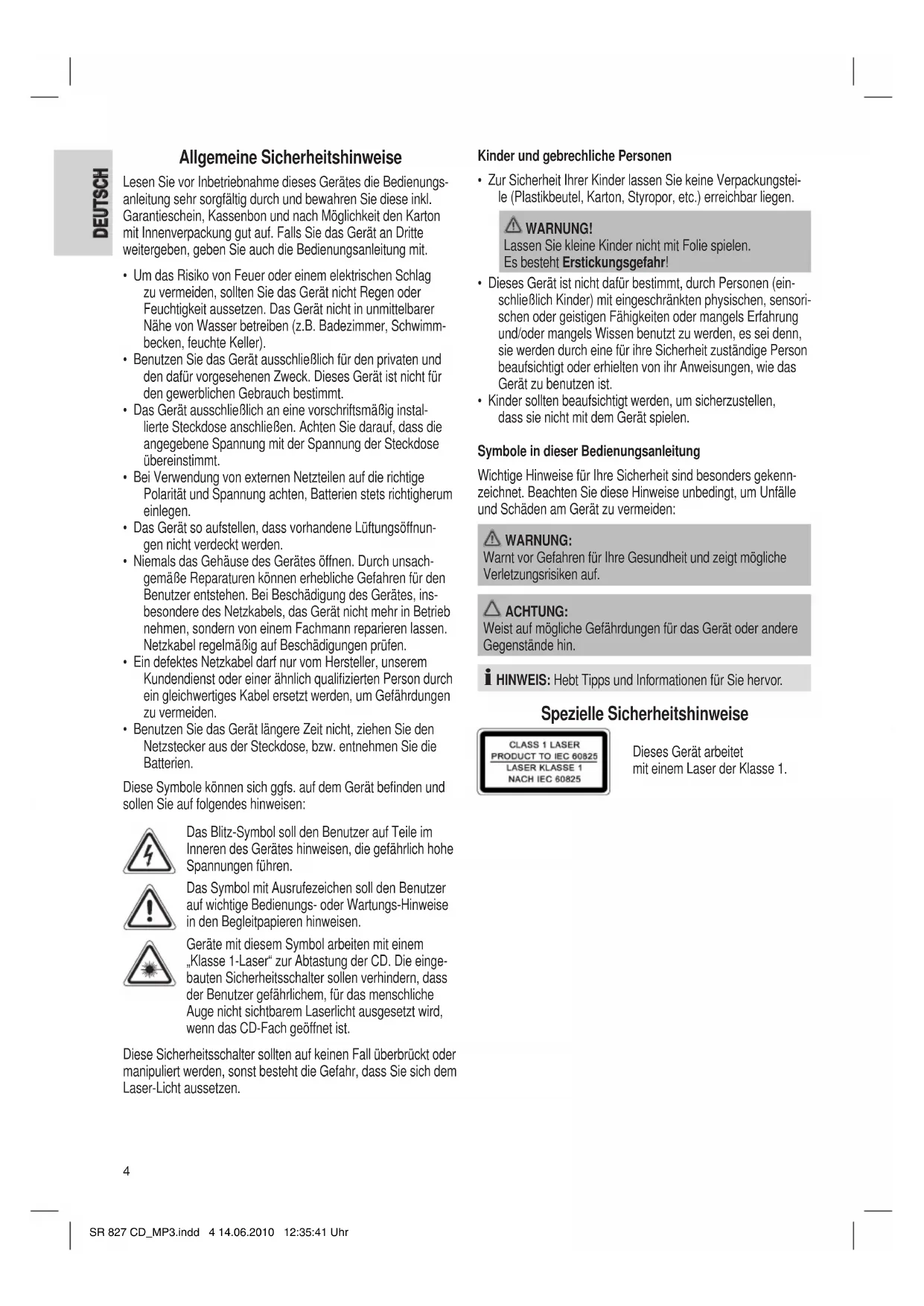 Geräte mit dieserem Symbol arbeiten mit einem „Klasse 1-Laser" zur Abtastung der CD. Die eingebauten Sicherheitschalter sollen verhindern, dass der Benutzer gefährlich, für das menschliche Auge nicht sightbarem Laserlicht ausgesetzt wird, wenn das CD-Fach geöffnet ist.