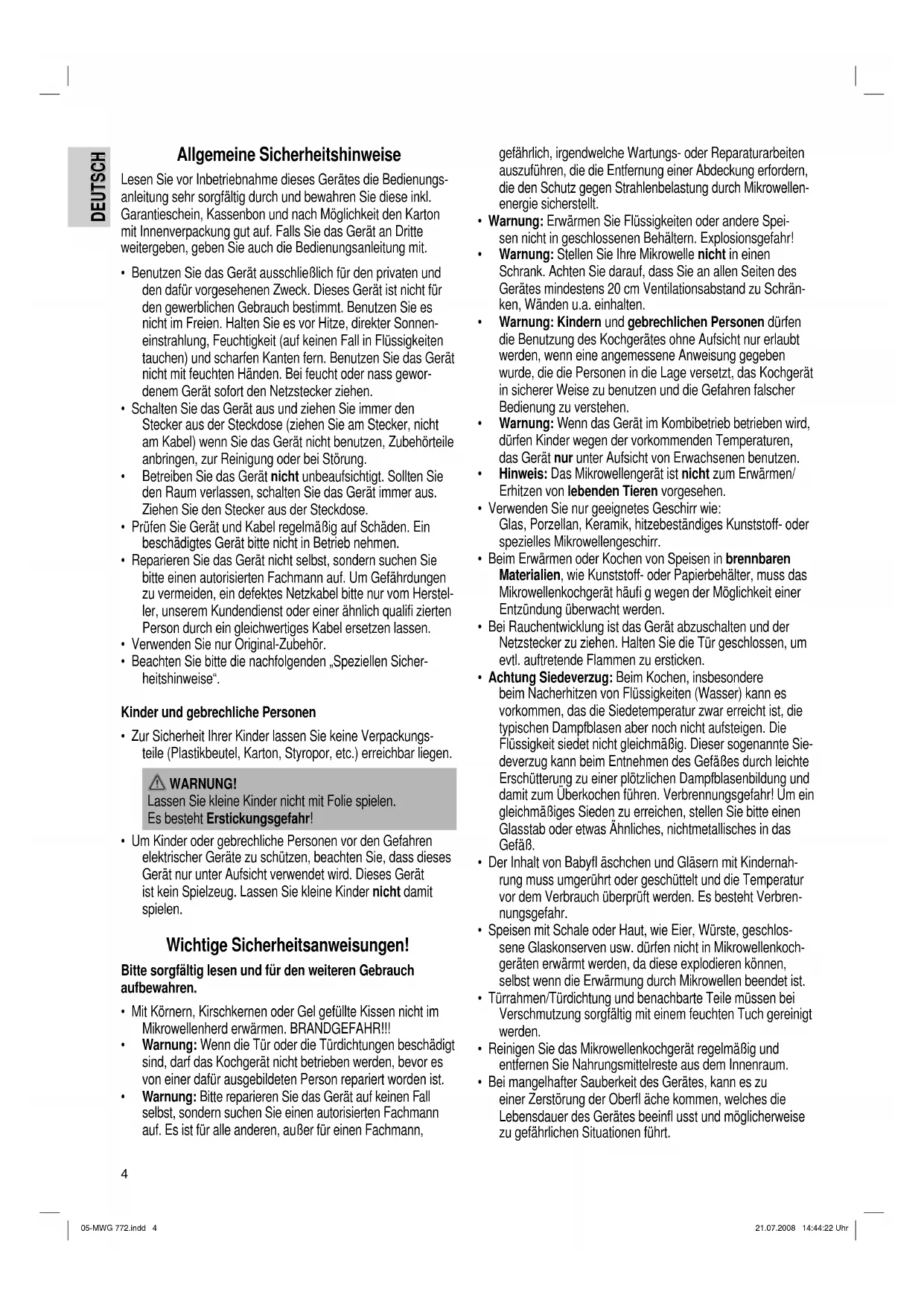 DEUTSCH DEUTSCH Allgemeine Sicherheitshinweise