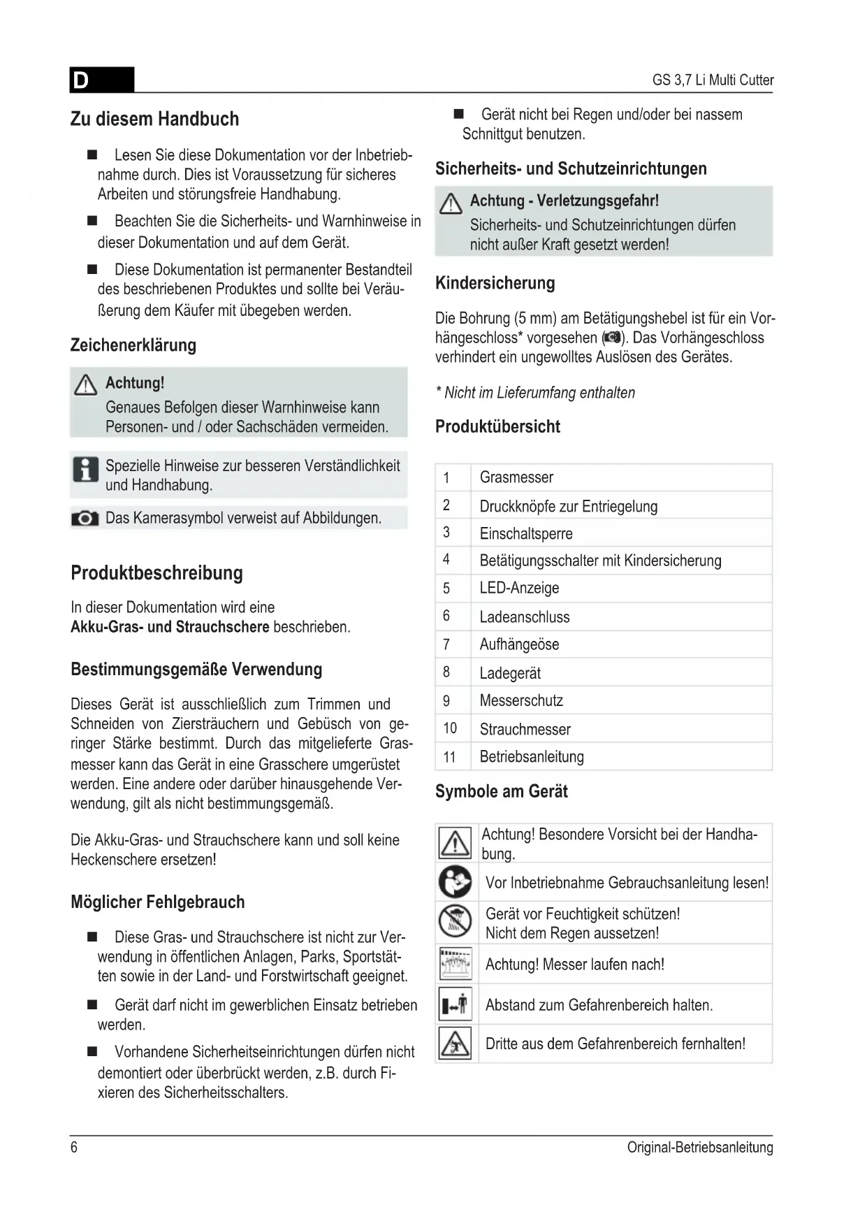 AKKU-GRAS- UND STRAUCHSCHERE GS 3,7 LI MULTI CUTTER Betriebsanleitung