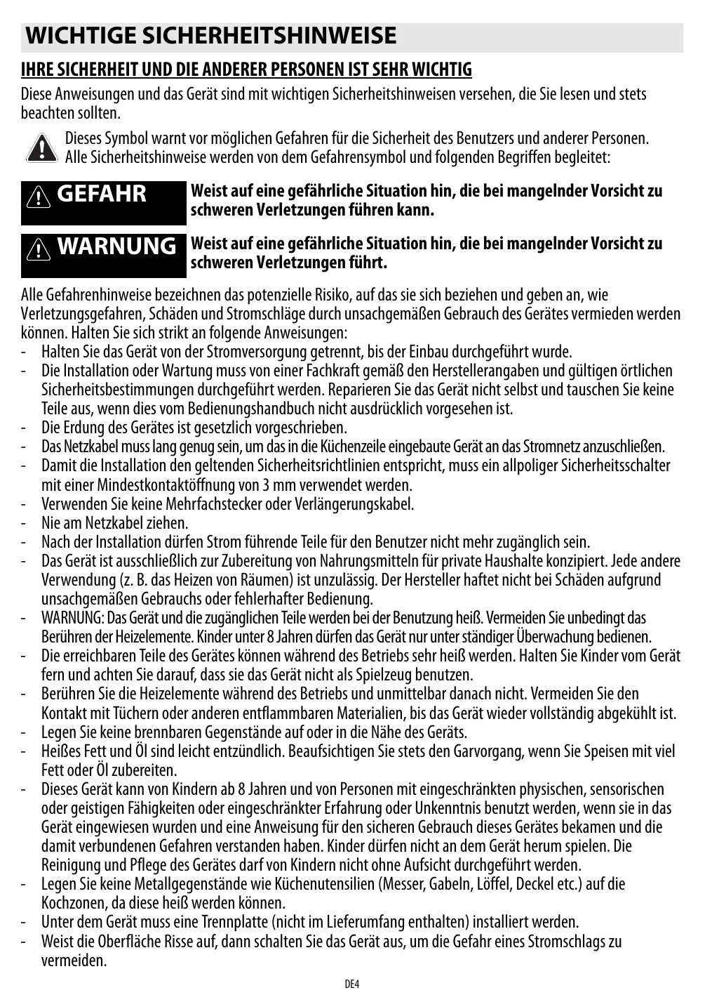Bedienungsanleitung Seite WICHTIGE SICHERHEITSHINWEISE IHRE SICHERHEIT UND DIE ANDERER PERSONEN IST SEHR WICHTIG Diese Anweisungen und das Gerät sind mit wichtigen Sicherheitshinweisen versehen, die Sie lesen und stets beachten sollten. Dieses Symbol warnt vor möglichen Gefahren für die Sicherheit des Benutzers und anderer Personen. Alle Sicherheitshinweise werden von dem Gefahrensymbol und folgenden Begriffen begleitet: GEFAHR Weist auf eine gefährliche Situation hin, die bei mangelnder Vorsicht zu schweren Verletzungen führen kann. WARNUNG Weist auf eine gefährliche Situation hin, die bei mangelnder Vorsicht zu schweren Verletzungen führt. Alle Gefahrenhinweise bezeichnen das potenzielle Risiko, auf das sie sich beziehen und geben an, wie Verletzungsgefahren, Schäden und Stromschläge durch unsachgemäßen Gebrauch des Gerätes vermieden werden können. Halten Sie sich strikt an folgende Anweisungen: - Halten Sie das Gerät von der Stromversorgung getrennt, bis der Einbau durchgeführt wurde. - Die Installation oder Wartung muss von einer Fachkraft gemäß den Herstellerangaben und gültigen örtlichen Sicherheitsbestimmungen durchgeführt werden. Reparieren Sie das Gerät nicht selbst und tauschen Sie keine Teile aus, wenn dies vom Bedienungshandbuch nicht ausdrücklich vorgesehen ist. - Die Erdung des Gerätes ist gesetzlich vorgeschrieben. - Das Netzkabel muss lang genug sein, um das in die Küchenzeile eingebaute Gerät an das Stromnetz anzuschließen. - Damit die Installation den geltenden Sicherheitsrichtlinien entspricht, muss ein allpoliger Sicherheitsschalter mit einer Mindestkontaktöffnung von 3 mm verwendet werden. - Verwenden Sie keine Mehrfachstecker oder Verlängerungskabel. - Nie am Netzkabel ziehen. - Nach der Installation dürfen Strom führende Teile für den Benutzer nicht mehr zugänglich sein. - Das Gerät ist ausschließlich zur Zubereitung von Nahrungsmitteln für private Haushalte konzipiert. Jede andere Verwendung (z. B. das Heizen von Räumen) ist unzulässig. Der Hersteller haftet nicht bei Schäden aufgrund unsachgemäßen Gebrauchs oder fehlerhafter Bedienung. - WARNUNG: Das Gerät und die zugänglichen Teile werden bei der Benutzung heiß. Vermeiden Sie unbedingt das Berühren der Heizelemente. Kinder unter 8 Jahren dürfen das Gerät nur unter ständiger Überwachung bedienen. - Die erreichbaren Teile des Gerätes können während des Betriebs sehr heiß werden. Halten Sie Kinder vom Gerät fern und achten Sie darauf, dass sie das Gerät nicht als Spielzeug benutzen. - Berühren Sie die Heizelemente während des Betriebs und unmittelbar danach nicht. Vermeiden Sie den Kontakt mit Tüchern oder anderen entflammbaren Materialien, bis das Gerät wieder vollständig abgekühlt ist. - Legen Sie keine brennbaren Gegenstände auf oder in die Nähe des Geräts. - Heißes Fett und Öl sind leicht entzündlich. Beaufsichtigen Sie stets den Garvorgang, wenn Sie Speisen mit viel Fett oder Öl zubereiten. - Dieses Gerät kann von Kindern ab 8 Jahren und von Personen mit eingeschränkten physischen, sensorischen oder geistigen Fähigkeiten oder eingeschränkter Erfahrung oder Unkenntnis benutzt werden, wenn sie in das Gerät eingewiesen wurden und eine Anweisung für den sicheren Gebrauch dieses Gerätes bekamen und die damit verbundenen Gefahren verstanden haben. Kinder dürfen nicht an dem Gerät herum spielen. Die Reinigung und Pflege des Gerätes darf von Kindern nicht ohne Aufsicht durchgeführt werden. - Legen Sie keine Metallgegenstände wie Küchenutensilien (Messer, Gabeln, Löffel, Deckel etc.) auf die Kochzonen, da diese heiß werden können. - Unter dem Gerät muss eine Trennplatte (nicht im Lieferumfang enthalten) installiert werden. - Weist die Oberfläche Risse auf, dann schalten Sie das Gerät aus, um die Gefahr eines Stromschlags zu vermeiden. DE4 - Das Gerät ist nicht für den Betrieb mittels externer Zeitschaltuhr oder getrenntem Fernbedienungssystem vorgesehen. - WARNUNG: Lassen Sie Speisen, die mit Öl oder Fett zubereitet werden, niemals unbeaufsichtigt auf dem Herd stehen, denn dies ist gefährlich und kann zu einem Brand führen. Versuchen Sie NIEMALS, einen Brand mit Wasser zu löschen, sondern schalten Sie das Gerät aus und decken Sie die Flamme mit einem Deckel oder einer speziellen Brandschutzdecke ab. WARNUNG: Brandgefahr: stellen Sie keine Gegenstände auf den Kochflächen ab. - Verwenden Sie keine Dampfstrahlreiniger! - Metallgegenstände wie Messer, Gabeln, Löffel und Deckel sollten nicht auf die Oberfläche des Kochfelds gelegt werden, da sie heiß werden können. - Schalten Sie das Kochfeld nach der Benutzung mit den Bedienelementen aus und verlassen Sie sich nicht allein auf die Topferkennung. DE5
