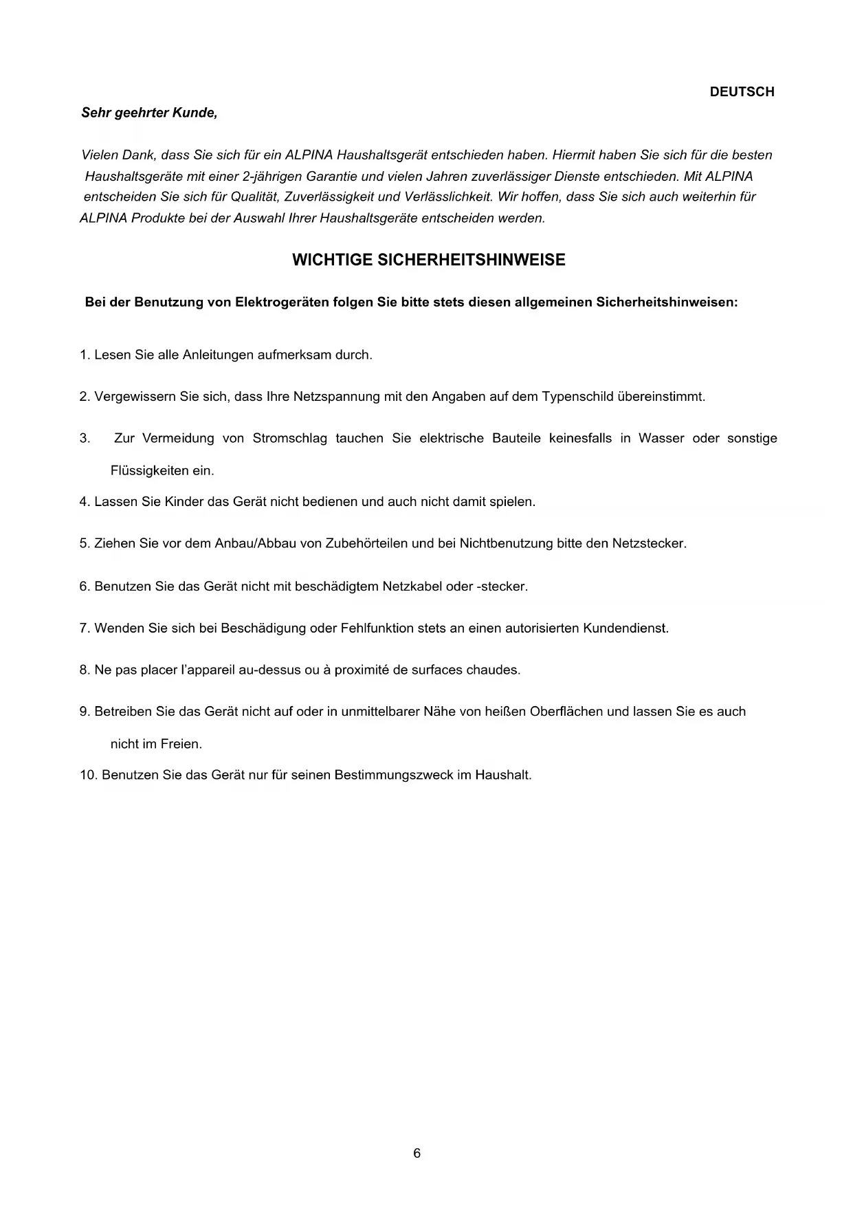 office, waste disposal service or the shop where you purchase the product. Specification Model No. : SF-2506 Voltage : 220-240V ~ 50Hz Wattage : 680-800watts 4ENGLISH GUARANTEE This product is guaranteed for a period of 2 years from the date of purchase against defects in materials and workmanship. Under this guarantee the manufacturer undertakes to repair or replace any parts found to be defective, provided the product is brought back to the purchase address. This guarantee is only valid if the appliance has been used in accordance with the instructions, and that it has not been modified, repaired or interfered with by any unauthorized person, or damaged through misuse. This guarantee does not cover wear and tear, or breakables such as ceramic items, etc. If the product fails to operate and needs to be returned, pack it carefully, enclosing your name and address and the reason for return and bring it to the address of purchase. If within the guarantee period, please also provide the guarantee card and proof of purchase. E-mail Service Address: info@swisselektro.com 5DEUTSCH Sehr geehrter Kunde, Vielen Dank, dass Sie sich für ein ALPINA Haushaltsgerät entschieden haben. Hiermit haben Sie sich für die besten Haushaltsgeräte mit einer 2-jährigen Garantie und vielen Jahren zuverlässiger Dienste entschieden. Mit ALPINA entscheiden Sie sich für Qualität, Zuverlässigkeit und Verlässlichkeit. Wir hoffen, dass Sie sich auch weiterhin für ALPINA Produkte bei der Auswahl Ihrer Haushaltsgeräte entscheiden werden. WICHTIGE SICHERHEITSHINWEISE Bei der Benutzung von Elektrogeräten folgen Sie bitte stets diesen allgemeinen Sicherheitshinweisen: