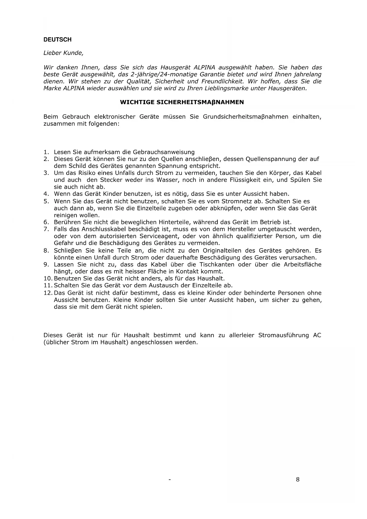 Lieber Kunde, Wir danken Ihnen, dass Sie sich das Hausgerät ALPINA ausgewählt haben. Sie haben das beste Gerät ausgewählt, das 2-jährige/24-monatige Garantie bietet und wird Ihnen jahrelang dienen. Wir stehen zu der Qualität, Sicherheit und Freundlichkeit. Wir hoffen, dass Sie die Marke ALPINA wieder auswählen und sie wird zu Ihren Lieblingsmarke unter Hausgeräten. WICHTIGE SICHERHEITSMAβNAHMEN Beim Gebrauch elektronischer Geräte müssen Sie Grundsicherheitsmaβnahmen einhalten, zusammen mit folgenden: