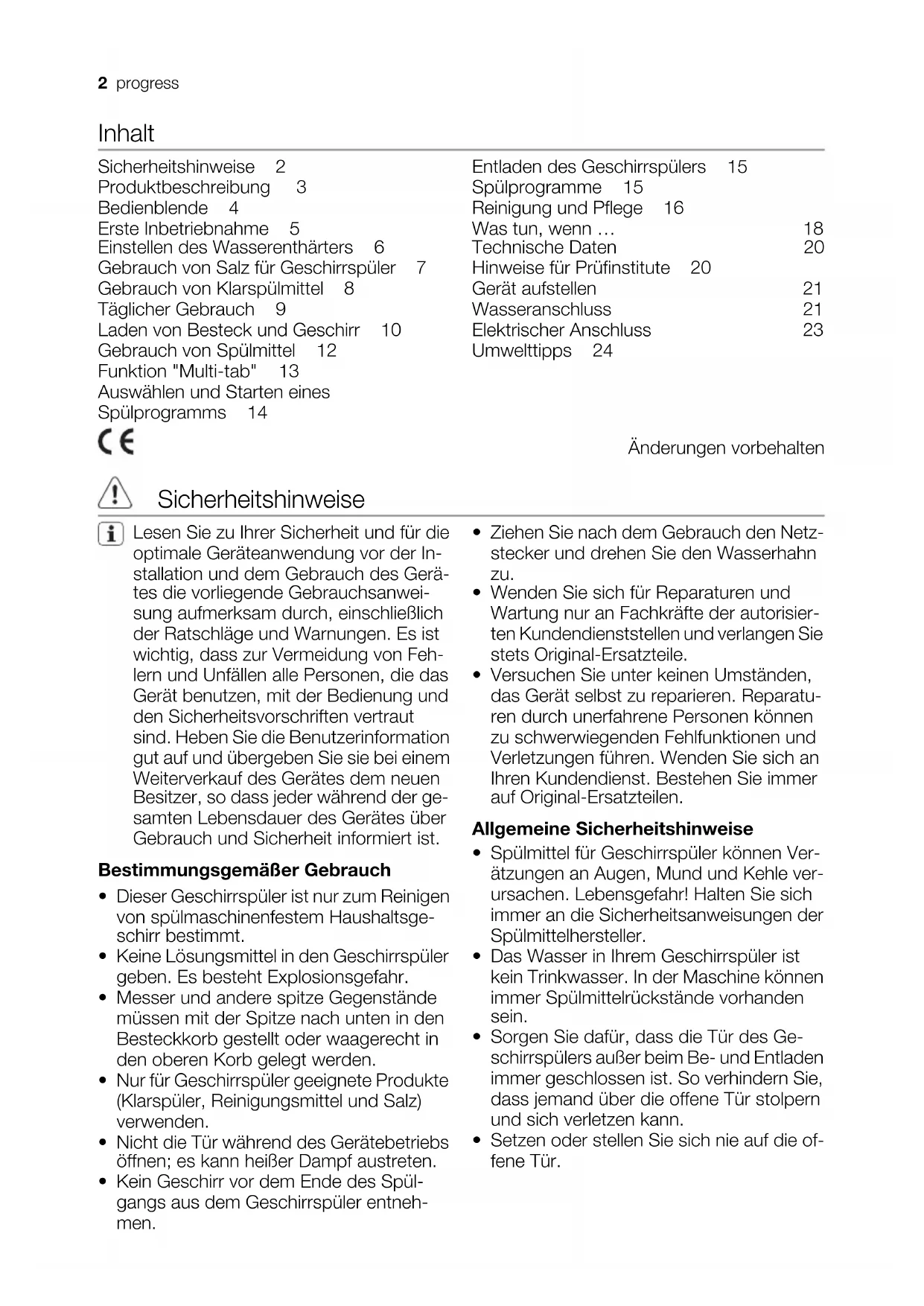 - Die Ursache kann beim Reinigungsmittel liegen. Bitte wenden Sie sich an den Kundendienst des Reinigungsmittel-Herstellers. Wenn die Störungen nach diesen Kontrollen fortbestehen, wenden Sie sich an den Kun- dendienst. progress 19Technische Daten Abmessungen Breite Höhe Tiefe 59,6 cm 81,8 - 87,8 cm 55,5 cm Elektrischer Anschluss - An- schlussspannung - Gesamtleis- tung - Sicherung Die Daten der elektrischen Anschlusswerte befinden sich auf dem Typenschild an der Innenseite der Geschirrspülertür. Wasserdruck Mindestdruck Höchstdruck 0,5 bar (0,05 MPa) 8 bar (0,8 MPa) Fassungsvermögen 12 Maßgedecke Hinweise für Prüfinstitute Die Prüfung muss nach EN 60704 bei voller Beladung mit dem Testprogramm (siehe Ta- belle "Verbrauchswerte") durchgeführt wer- den. Die Prüfung muss nach EN 50242 mit vollem Salz- und Klarspülerbehälter und mit dem Testprogramm (siehe "Verbrauchswerte") durchgeführt werden. Volle Beladung: 12 Maßgedecke Reinigungsmitteldosierung: 5 g + 25 g (Typ B) Klarspülereinstellung Position 4 (Typ III) Anordnung des Oberkorbs Tassenauflagen: Stellung A 20 progressAnordnung des Unterkorbs Anordnung des Besteckkorbs Gerät aufstellen Warnung! Der elektrische Anschluss des Gerätes und alle sonstigen Installationsarbeiten dürfen nur von qualifizierten Elektrikern und Installateuren ausgeführt werden. Entfernen Sie vor dem Aufstellen der Maschi- ne das gesamte Verpackungsmaterial. Das Gerät möglichst in der Nähe eines Was- serhahns und eines Wasserablaufs aufstel- len. Der Geschirrspüler ist zum Einbau unter einer Küchen-Arbeitsplatte bestimmt. Achtung! Halten Sie sich für den Einbau des Geschirrspülers und der Anbauplatte strikt an die Anweisungen auf der beiliegenden Schablone. Es sind keine Lüftungsöffnungen für den Ge- schirrspüler erforderlich, sondern nur Durch- führungen für den Wasserzulauf- und den Ablaufschlauch und das Netzkabel. Der Geschirrspüler ist mit höhenverstellbaren Füßen ausgestattet. Bei allen Arbeiten, die den Zugang zu den in- neren Bauteilen erfordern, muss zuvor der Netzstecker gezogen werden. Stellen Sie vor dem Einbau des Geschirrspü- lers in die Küchenzeile sicher, dass der Was- ser-, der Ablaufschlauch und das Netzkabel weder geknickt noch gequetscht werden. Fixieren des Geschirrspülers Der Geschirrspüler muss gegen unbeabsich- tigtes Kippen geschützt werden. Aus diesem Grund ist sicherzustellen, dass die Arbeitsplatte, unter die der Geschirrspü- ler eingeschoben wird, ordnungsgemäß und sicher (an benachbarten Küchenschränken/- möbeln usw.) befestigt ist. Ausrichten Korrektes Ausrichten ist die Voraussetzung dafür, dass die Tür wasserdicht schließt. Bei richtiger Ausrichtung darf die Tür beim Öffnen auf keiner Seite des Küchenmöbels anstoßen. Die Geräteausrichtung ggf. durch Anziehen oder Lockern der Stellfüße nachstellen. Wasseranschluss Wasserzuleitung Das Gerät kann mit Warmwasser (max. 60°) wie auch mit Kaltwasser gespeist werden. Mit einer Warmwasserversorgung können Sie unter Umständen deutlich Energie spa- ren. Allerdings kommt es dabei darauf an, wie das Warmwasser aufbereitet wird. (Wir progress 21empfehlen alternative Energiequellen, die be- sonders umweltfreundlich sind wie zum Bei- spiel Solar- bzw. Photovoltaikanlagen oder Windenergie). Wenn Sie den Anschluss selbst durchführen: die Kopplungsmutter des Wassereinlauf- schlauchs des Gerätes ist für ein Rohrgewin- de 3/4" ausgelegt oder für spezielle Schnell- kupplungen wie zum Beispiel Press-Block. Der Wasserdruck muss innerhalb des in den "Technischen Daten" aufgeführten Bereichs liegen. Ihr Wasserwerk kann Sie über die durchschnittlichen Druckwerte in Ihrem Ge- biet informieren. Der Wasserzulaufschlauch darf beim An- schluss nicht geknickt, gequetscht oder ver- dreht werden. Dieses Gerät besitzt einen Zulauf- und Ab- laufschlauch, die nach rechts oder links ver- legt werden können, um die Installation mit der Klemmmutter zu erleichtern. Die Klemmmutter muss zur Vermeidung von Lecks richtig angebracht werden. Achtung! NICHT alle Geschirrspülermo- delle werden mit Zulauf- und Ablauf- schläuchen mit einer Klemmmutter ge- liefert. In diesem Fall ist die genannte Verlegung nicht möglich. Falls das Gerät mit neuen oder lange Zeit nicht benutzten Schläuchen angeschlossen wird, lassen Sie bitte vor dem Anschluss des Zulaufschlauchs einige Minuten lang Wasser durch diesen fließen. BENUTZEN Sie KEINE Anschluss- schläuche von Altgeräten. Das Gerät ist mit einer Sicherheitsvor- richtung versehen, die verhindert, dass das im Geschirrspüler verwendete Was- ser in das Trinkwassersystem zurück- laufen kann. Das Gerät entspricht den gültigen Vorschriften für Installationsar- beiten. Wasserschlauch mit Sicherheitsventil Nach dem Anschluss des doppelwandigen Wasserschlauchs befindet sich das Sicher- heitsventil in der Nähe des Wasserhahns. Der Wasserschlauch steht daher nur während der Versorgung des Geschirrspülers unter Druck. Sobald der Wasserschlauch zu le- cken beginnt, unterbricht das Sicherheits- ventil die Wasserversorgung. Berücksichtigen Sie bei der Verlegung des Wasserschlauchs: