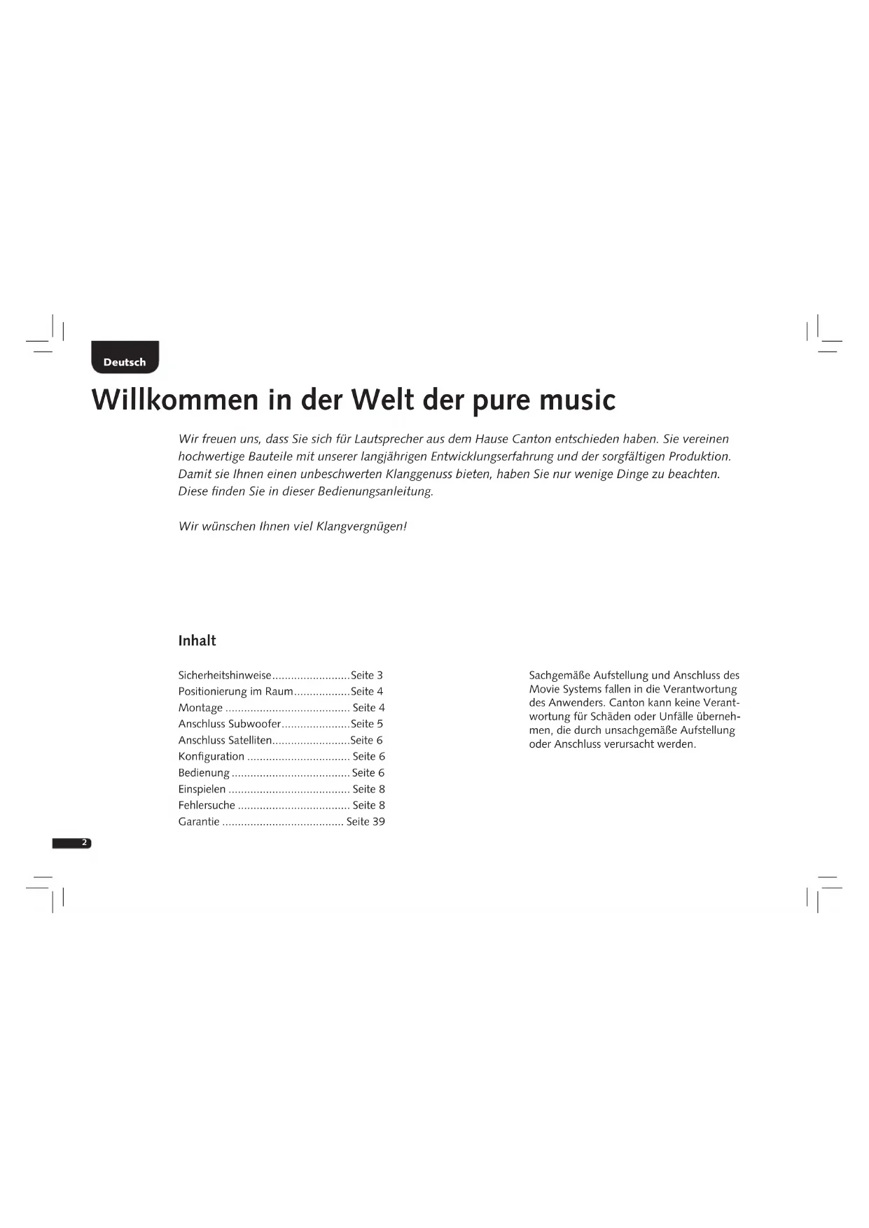 Art. Nr. 15318 Seriennummer / Serial Number / Numéro de série / Número de serie Numero di serie / Серийный номер / Serienummer / Numer seryjny Name und Adresse des Käufers / Name and Address of Purchaser Nom et adresse de l‘acheteur / Nombre y dirección del comprador Nome e indirizzo dell’acquirente / ФИО и адрес покупателя Köparens namn och adress Naam en adres van de koper Nazwisko i adres kupującego Händlerstempel / Dealer Stamp / Tampon du revendeur / Sello del proveedor Timbro del rivenditore / Штамп магазина, продавшего товар Återförsäljarens stämpel / Stempel van de handelaar / Pieczątka sprzedawcy Garantie-Urkunde Guarantee Certificate · Certificat de garantie · Certificado de garantía Certificato di garanzia · Гарантийное свидетельство Garanticertifikat · Garantiebewijs · Karta gwarancyjna www.canton.de Art. Nr. 118801 ENG DEU FRA ESP ITA RUS SWE NED POL Garantie-Urkunde Guarantee Certificate · Certificat de garantie · Certificado de garantía Certificato di garanzia · Гарантийное свидетельство Garanticertifikat · Garantiebewijs · Karta gwarancyjna Movie BeDieNuNgSANleiTuNg OPeRATiNg iNSTRuCTiONS NOTiCe D‘uTiliSATiON iNSTRuCCiONeS De uSO iSTRuziONi D’uSO РукОвОдСтвО пО экСплуатацИИ BRuKSANviSNiNg geBRuiKSAANWiJziNg iNSTRuKCJA OBSługi2 Inhalt Sicherheitshinweise ......................... Seite 3 Positionierung im Raum .................. Seite 4 Montage ........................................ Seite 4 Anschluss Subwoofer ...................... Seite 5 Anschluss Satelliten ......................... Seite 6 Konfiguration ................................. Seite 6 Bedienung ...................................... Seite 6 Einspielen ....................................... Seite 8 Fehlersuche .................................... Seite 8 Garantie ....................................... Seite 39 Deutsch Willkommen in der Welt der pure music Wir freuen uns, dass Sie sich für Lautsprecher aus dem Hause Canton entschieden haben. Sie vereinen hochwertige Bauteile mit unserer langjährigen Entwicklungserfahrung und der sorgfältigen Produktion. Damit sie Ihnen einen unbeschwerten Klanggenuss bieten, haben Sie nur wenige Dinge zu beachten. Diese finden Sie in dieser Bedienungsanleitung. Wir wünschen Ihnen viel Klangvergnügen! Sachgemäße Aufstellung und Anschluss des Movie Systems fallen in die Verantwortung des Anwenders. Canton kann keine Verant- wortung für Schäden oder Unfälle überneh- men, die durch unsachgemäße Aufstellung oder Anschluss verursacht werden.3 Deutsch Sicherheitshinweise Bitte beachten Sie die Sicherheitshinweise bei der Wahl des richtigen Platzes für Ihr Movie System und bei dessen Pflege und Bedienung! Wählen Sie einen ebenen Untergrund