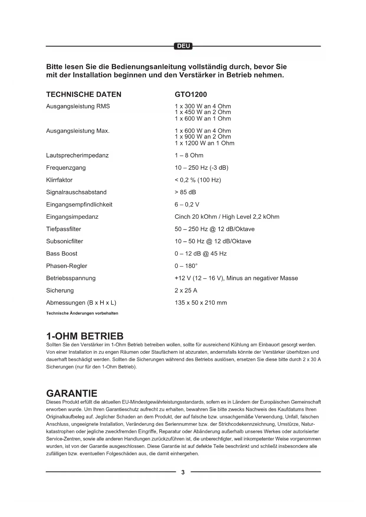 | TECHNISCHE DATEN | GTO1200 |