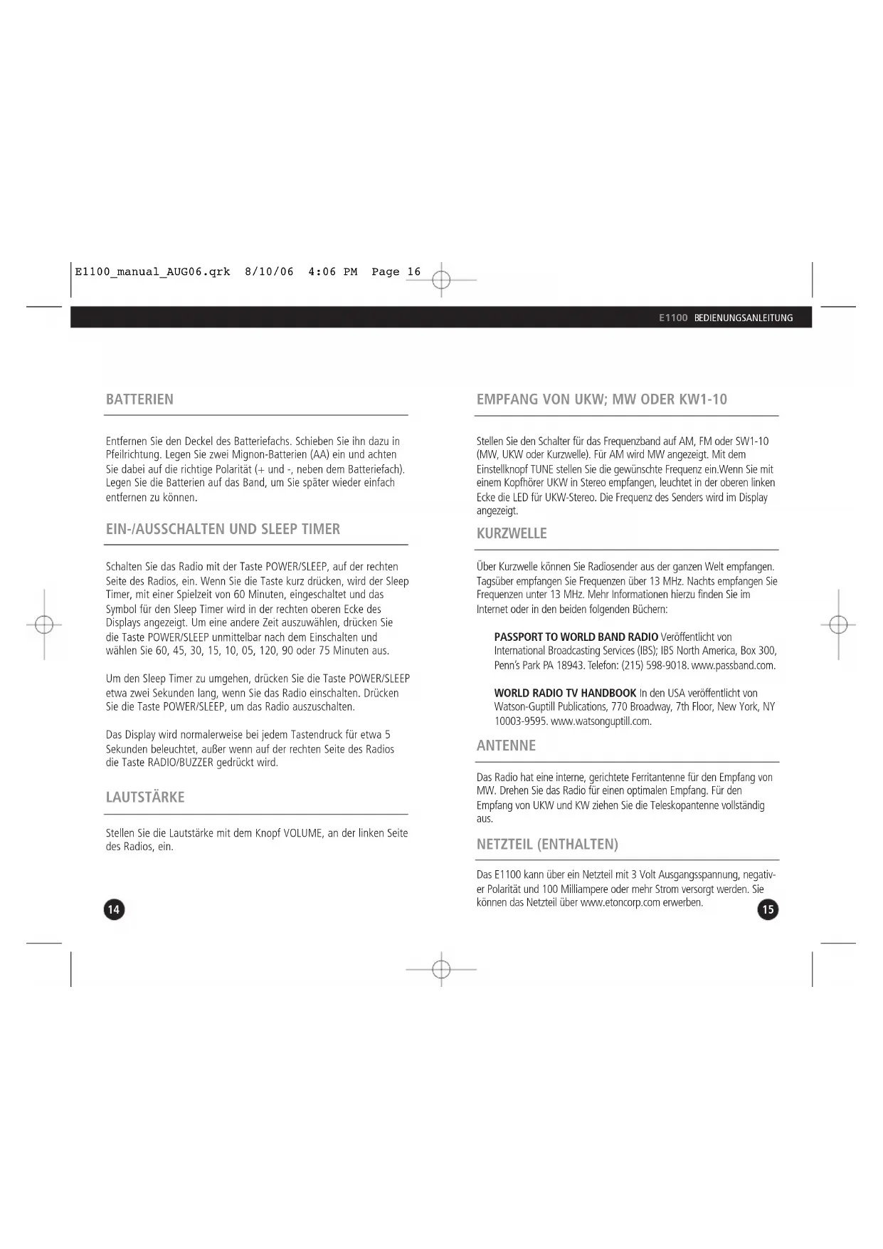 EMPFANG VON UKW; MW ODER KW1-10 Entfernen Sie den Deckel des Batteriefachs. Schieben Sie ihn dazu in Pfeilrichtung. Legen Sie zwei Mignon-Batterien (AA) ein und achten Sie dabei auf die richtige Polarität (+ und -, neben dem Batteriefach). Legen Sie die Batterien auf das Band, um Sie später wieder einfach entfernen zu können. Schalten Sie das Radio mit der Taste POWER/SLEEP, auf der rechten Seite des Radios, ein. Wenn Sie die Taste kurz drücken, wird der Sleep Timer, mit einer Spielzeit von 60 Minuten, eingeschaltet und das Symbol für den Sleep Timer wird in der rechten oberen Ecke des Displays angezeigt. Um eine andere Zeit auszuwählen, drücken Sie die Taste POWER/SLEEP unmittelbar nach dem Einschalten und wählen Sie 60, 45, 30, 15, 10, 05, 120, 90 oder 75 Minuten aus. Um den Sleep Timer zu umgehen, drücken Sie die Taste POWER/SLEEP etwa zwei Sekunden lang, wenn Sie das Radio einschalten. Drücken Sie die Taste POWER/SLEEP, um das Radio auszuschalten. Das Display wird normalerweise bei jedem Tastendruck für etwa 5 Sekunden beleuchtet, außer wenn auf der rechten Seite des Radios die Taste RADIO/BUZZER gedrückt wird. Stellen Sie die Lautstärke mit dem Knopf VOLUME, an der linken Seite des Radios, ein. BATTERIEN Stellen Sie den Schalter für das Frequenzband auf AM, FM oder SW1-10 (MW, UKW oder Kurzwelle). Für AM wird MW angezeigt. Mit dem Einstellknopf TUNE stellen Sie die gewünschte Frequenz ein.Wenn Sie mit einem Kopfhörer UKW in Stereo empfangen, leuchtet in der oberen linken Ecke die LED für UKW-Stereo. Die Frequenz des Senders wird im Display angezeigt. Über Kurzwelle können Sie Radiosender aus der ganzen Welt empfangen. Tagsüber empfangen Sie Frequenzen über 13 MHz. Nachts empfangen Sie Frequenzen unter 13 MHz. Mehr Informationen hierzu finden Sie im Internet oder in den beiden folgenden Büchern: PASSPORT TO WORLD BAND RADIO Veröffentlicht von International Broadcasting Services (IBS); IBS North America, Box 300, Penn’s Park PA 18943. Telefon: (215) 598-9018. www.passband.com. WORLD RADIO TV HANDBOOK In den USA veröffentlicht von Watson-Guptill Publications, 770 Broadway, 7th Floor, New York, NY 10003-9595. www.watsonguptill.com. Das Radio hat eine interne, gerichtete Ferritantenne für den Empfang von MW. Drehen Sie das Radio für einen optimalen Empfang. Für den Empfang von UKW und KW ziehen Sie die Teleskopantenne vollständig aus. Das E1100 kann über ein Netzteil mit 3 Volt Ausgangsspannung, negativ- er Polarität und 100 Milliampere oder mehr Strom versorgt werden. Sie können das Netzteil über www.etoncorp.com erwerben.