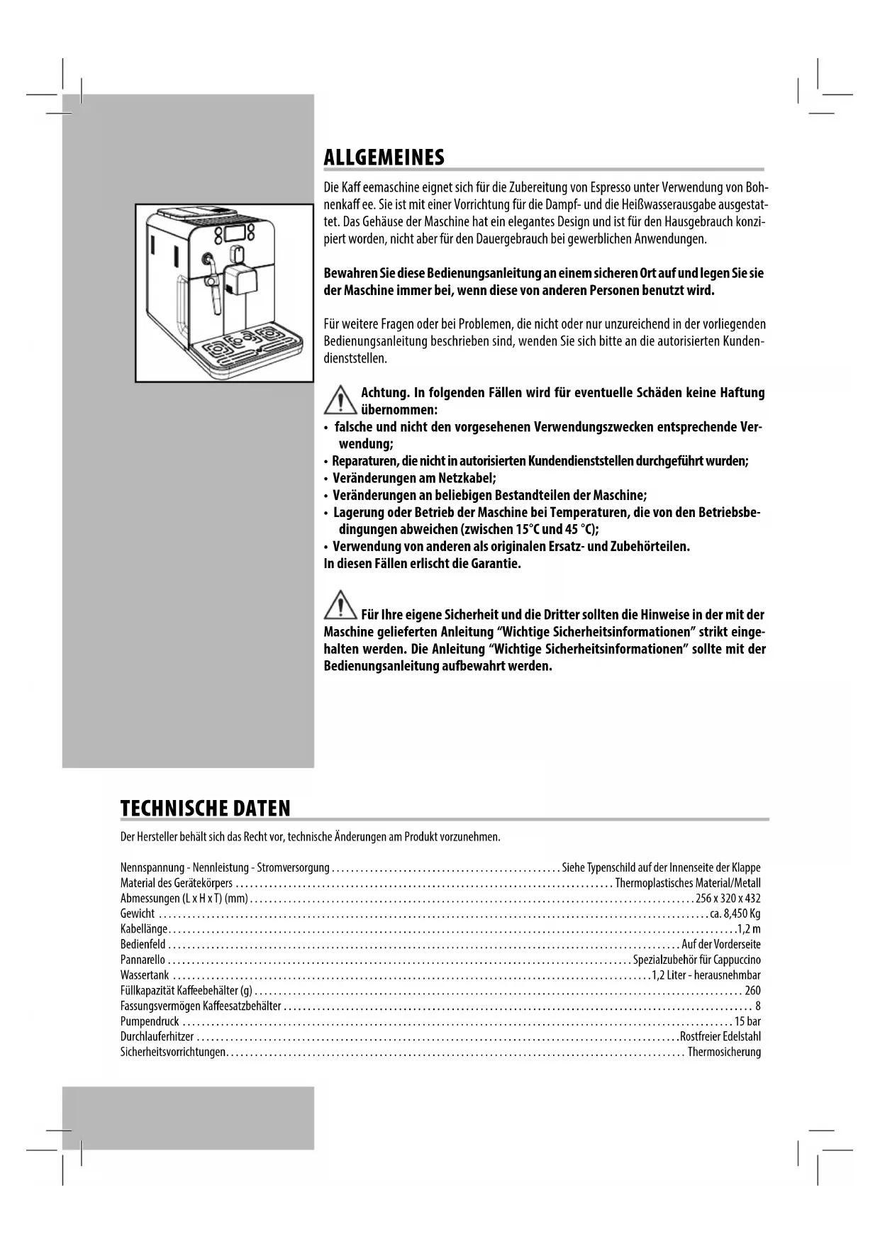 ALLGEMEINES Die Ka eemaschine eignet sich für die Zubereitung von Espresso unter Verwendung von Boh-