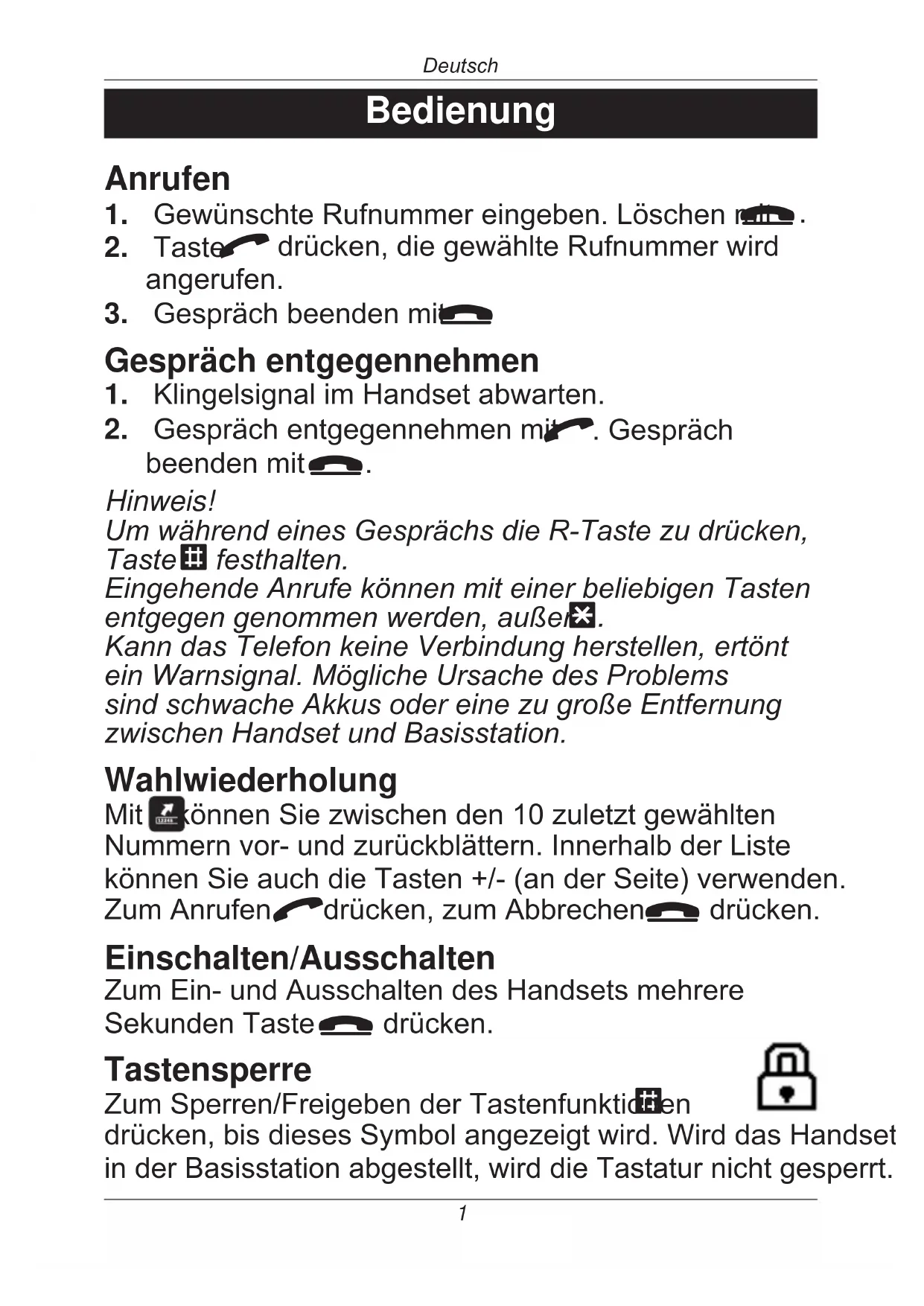 drücken,bisdiesesSymbolangezeigtwird.WirddasHandset inderBasisstationabgestellt,wirddieTastaturnichtgesperrt.2 Deutsch Klingelton ein/aus ZumEin-/AusschaltendesKlingeltonsimHandset