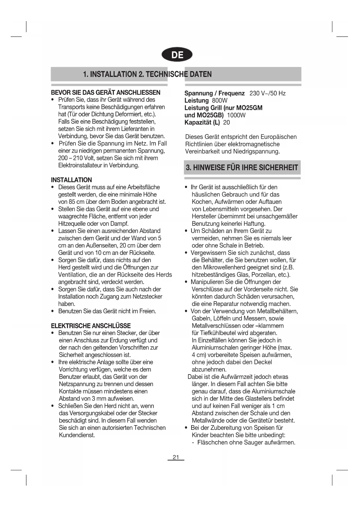 3. HINWEISE FÜR IHRE SICHERHEIT BEVOR SIE DAS GERÄT ANSCHLIESSEN