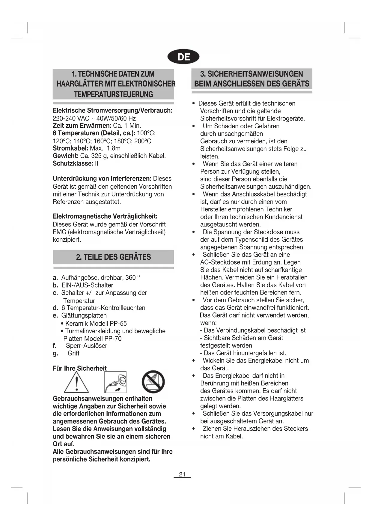1. TECHNISCHE DATEN ZUM HAARGLÄTTER MIT ELEKTRONISCHER TEMPERATURSTEUERUNG Elektrische Stromversorgung/Verbrauch: