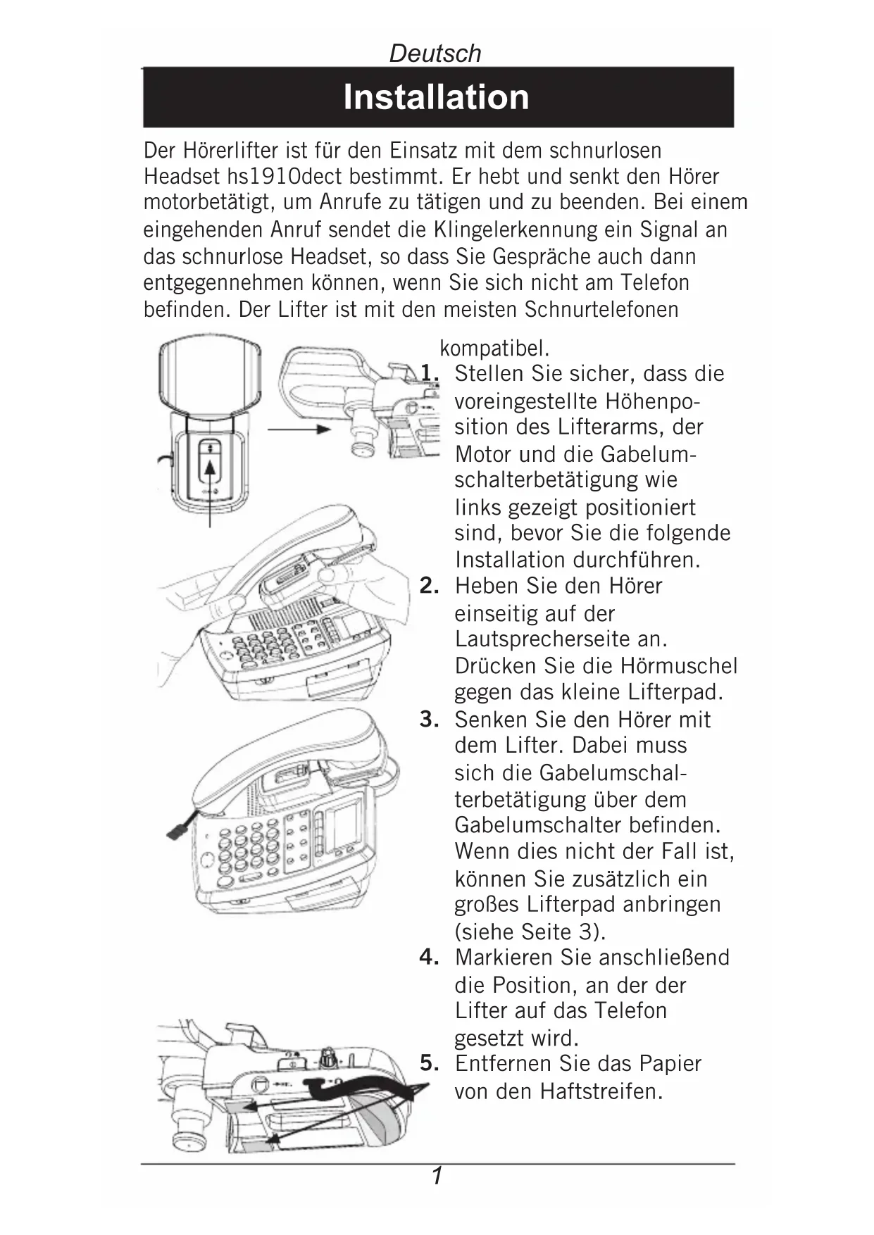Der Hörerlifter ist für den Einsatz mit dem Schnurlosen Headset hs1910duct bestimmt. Er—hebt und senkt den Hörer motorbetätig, um Anrufe zu tätigen und zu beenden. Bei einem eingehenden Anruf sendet die Klingelerkennung ein Signal and das Schnurlose Headset, so dass Sie Geschäfte auch dann entgegenhalten konnen, wenn Sie sich nicht am Telefon befinden. Der Lifter ist mit den meisten Schnurtelefonen