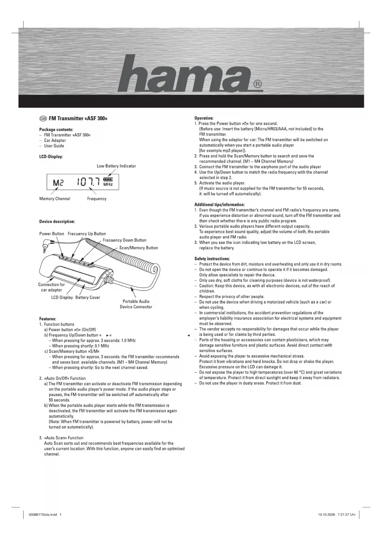Finden Sie kostenlos die Bedienungsanleitung des Geräts ASF 300 HAMA als PDF.