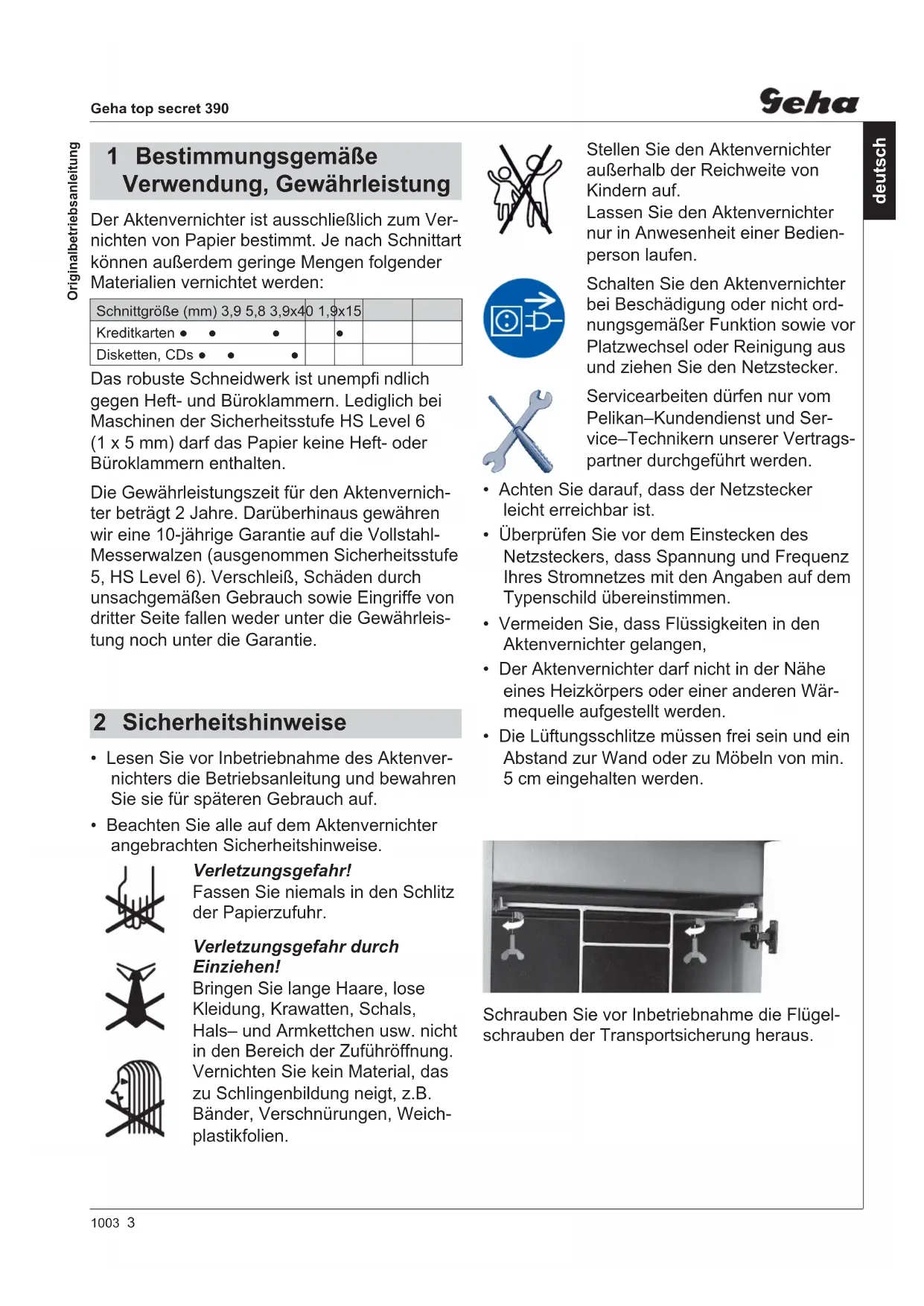 - Beachten Sie alle auf dem Aktenvernichter angebrachten Sicherheitshinweise. Verletzungsgefahr! Fassen Sie niemals in den Schlitz der Papierzufuhr. Verletzungsgefahr durch Einziehen! Bringen Sie lange Haare, lose Kleidung, Krawatten, Schals, Hals– und Armkettchen usw. nicht in den Bereich der Zuführöffnung. Vernichten Sie kein Material, das zu Schlingenbildung neigt, z.B. Bänder, Verschnürungen, Weich- plastikfolien. 2 Sicherheitshinweise Schrauben Sie vor Inbetriebnahme die Flügel- schrauben der Transportsicherung heraus. Originalbetriebsanleitung4 1003Geha top secret 390 deutsch Aktenvernichter einschalten