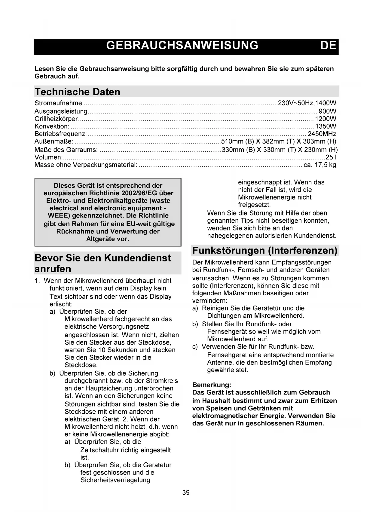Stromaufnahme 230V~50Hz,1400W Ausgangsleistung 900W Grillheizkörper 1200W Konvektion:1350W Betriebsfrequenz: 2450MHz