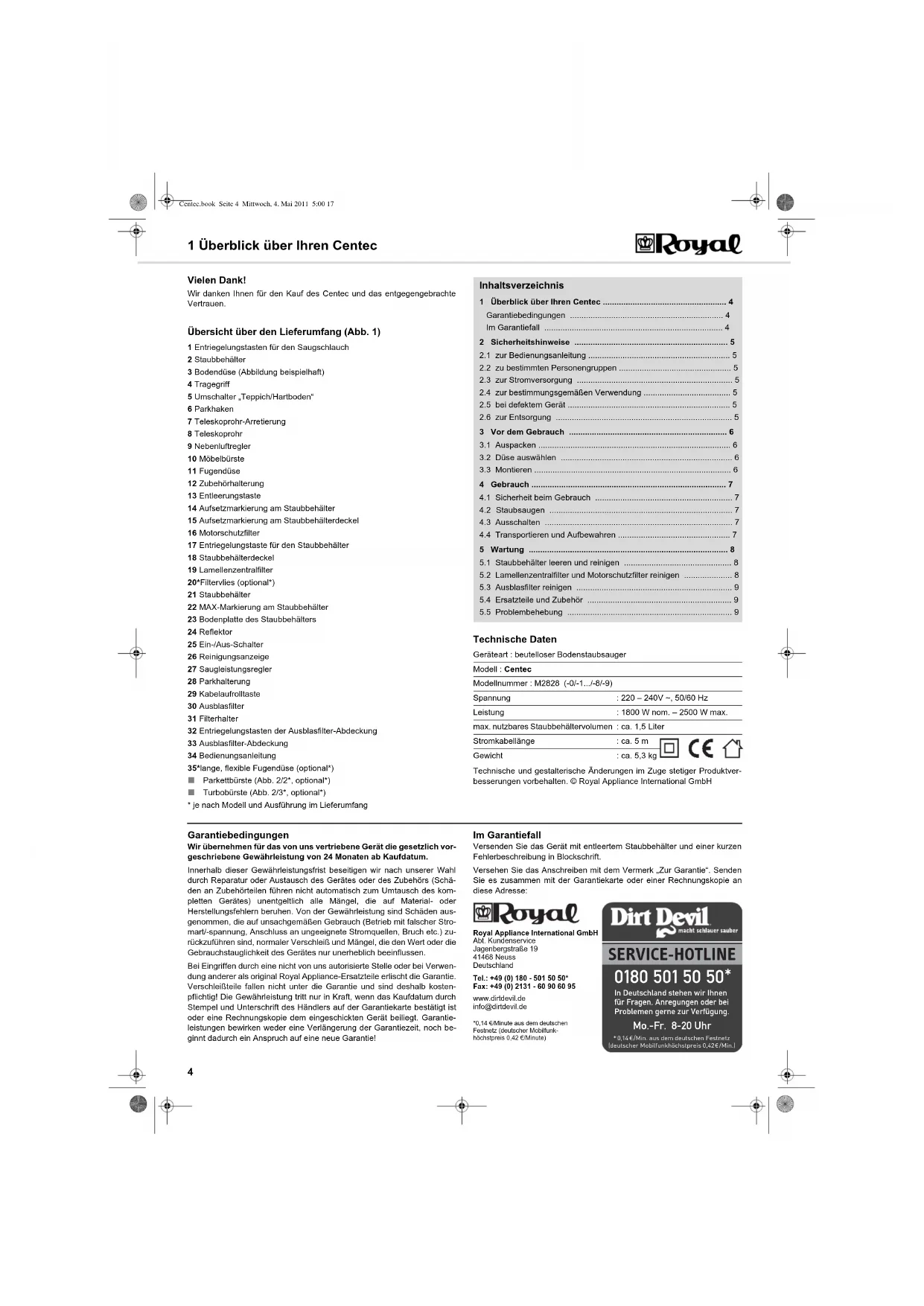 Appliance-Ersatzteile erlischt die Garantie.Verschleißteile fallen nicht unter die Garantie und sind deshalb kosten-pflichtig! Die Gewährleistung tritt nur in Kraft, wenn das Kaufdatum durchStempel und Unterschrift des Händlers auf der Garantiekarte bestätigt istoder eine Rechnungskopie dem eingeschickten Gerät beiliegt. Garantie-leistungen bewirken weder eine Verlängerung der Garantiezeit, noch be-ginnt dadurch ein Anspruch auf eine neue Garantie! Im Garantiefall Versenden Sie das Gerät mit entleertem Staubbehälter und einer kurzenFehlerbeschreibung in Blockschrift. Versehen Sie das Anschreiben mit dem Vermerk „Zur Garantie“. SendenSie es zusammen mit der Garantiekarte oder einer Rechnungskopie andiese Adresse:Royal Appliance International GmbHAbt. KundenserviceJagenbergstraße 1941468 NeussDeutschlandTel.: +49 (0) 180 - 501 50 50*Fax: +49 (0) 2131 - 60 90 60 95www.dirtdevil.deinfo@dirtdevil.de*0,14 €/Minute aus dem deutschen Festnetz (deutscher Mobilfunk-höchstpreis 0,42 €/Minute)Geräteart : beutelloser BodenstaubsaugerModell : Centec Modellnummer : M2828 (-0/-1.../-8/-9)Spannung : 220 – 240V ~, 50/60 HzLeistung : 1800 W nom. – 2500 W max. max. nutzbares Staubbehältervolumen : ca. 1,5 Liter Stromkabellänge : ca. 5 m Gewicht : ca. 5,3 kg