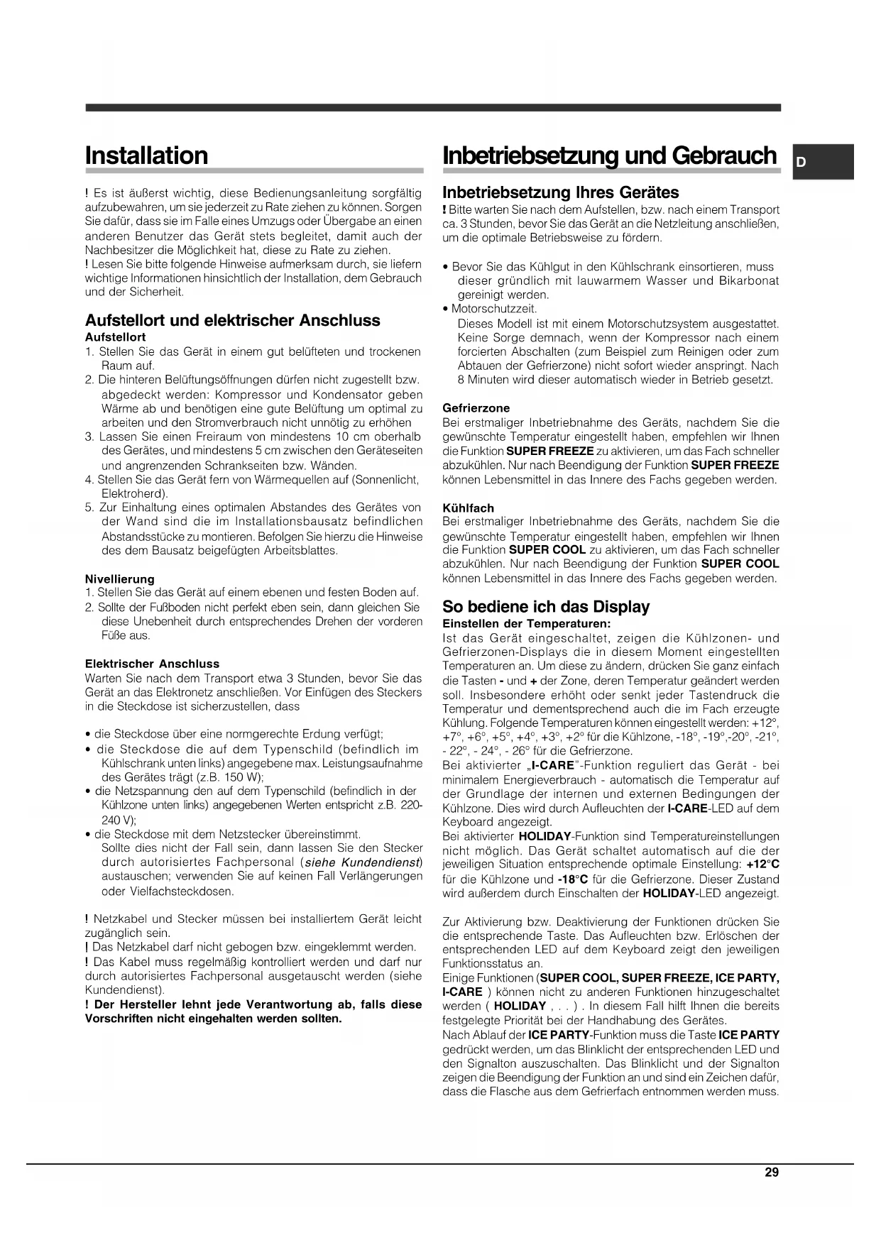 Inbetriebsetzung Ihres Gerätes ! Bitte warten Sie nach dem Aufstellen, bzw. nach einem Transportca. 3 Stunden, bevor Sie das Gerät an die Netzleitung anschließen,um die optimale Betriebsweise zu fördern.• Bevor Sie das Kühlgut in den Kühlschrank einsortieren, mussdieser gründlich mit lauwarmem Wasser und Bikarbonatgereinigt werden.• Motorschutzzeit.Dieses Modell ist mit einem Motorschutzsystem ausgestattet.Keine Sorge demnach, wenn der Kompressor nach einemforcierten Abschalten (zum Beispiel zum Reinigen oder zumAbtauen der Gefrierzone) nicht sofort wieder anspringt. Nach8 Minuten wird dieser automatisch wieder in Betrieb gesetzt.GefrierzoneBei erstmaliger Inbetriebnahme des Geräts, nachdem Sie diegewünschte Temperatur eingestellt haben, empfehlen wir Ihnen die Funktion SUPER FREEZE zu aktivieren, um das Fach schneller abzukühlen. Nur nach Beendigung der Funktion SUPER FREEZEkönnen Lebensmittel in das Innere des Fachs gegeben werden.KühlfachBei erstmaliger Inbetriebnahme des Geräts, nachdem Sie diegewünschte Temperatur eingestellt haben, empfehlen wir Ihnen die Funktion SUPER COOL zu aktivieren, um das Fach schneller abzukühlen. Nur nach Beendigung der Funktion SUPER COOLkönnen Lebensmittel in das Innere des Fachs gegeben werden. So bediene ich das Display Einstellen der Temperaturen:Ist das Gerät eingeschaltet, zeigen die Kühlzonen- undGefrierzonen-Displays die in diesem Moment eingestelltenTemperaturen an. Um diese zu ändern, drücken Sie ganz einfach die Tasten - und + der Zone, deren Temperatur geändert werden soll. Insbesondere erhöht oder senkt jeder Tastendruck dieTemperatur und dementsprechend auch die im Fach erzeugteKühlung. Folgende Temperaturen können eingestellt werden: +12°,+7°, +6°, +5°, +4°, +3°, +2° für die Kühlzone, -18°, -19°,-20°, -21°,- 22°, - 24°, - 26° für die Gefrierzone. Bei aktivierter „I-CARE”-Funktion reguliert das Gerät - bei minimalem Energieverbrauch - automatisch die Temperatur aufder Grundlage der internen und externen Bedingungen der Kühlzone. Dies wird durch Aufleuchten der I-CARE-LED auf dem Keyboard angezeigt. Bei aktivierter HOLIDAY-Funktion sind Temperatureinstellungen nicht möglich. Das Gerät schaltet automatisch auf die derjeweiligen Situation entsprechende optimale Einstellung: +12°C für die Kühlzone und -18°C für die Gefrierzone. Dieser Zustand