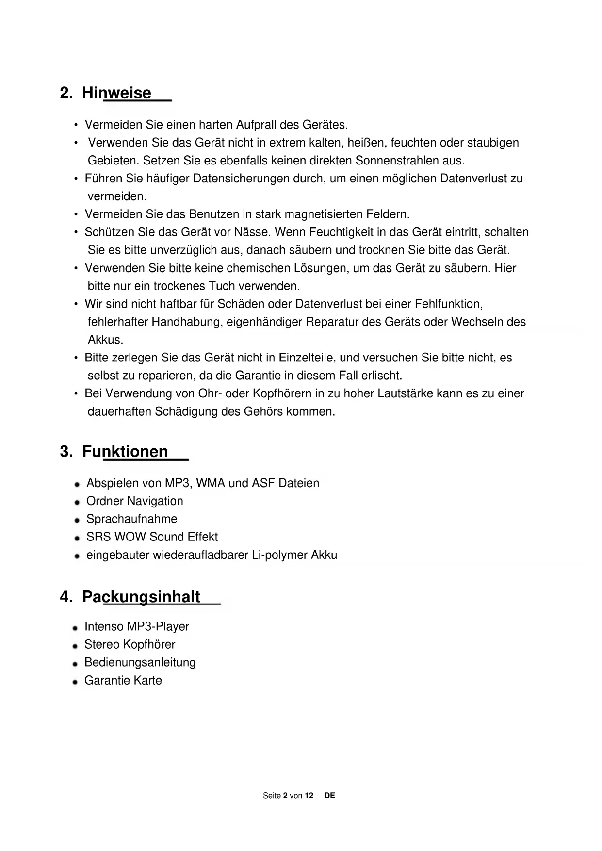 Intenso MP3-Player Stereo Kopfhörer Bedienungsanleitung Garantie KarteSeite 3 von 12 DE