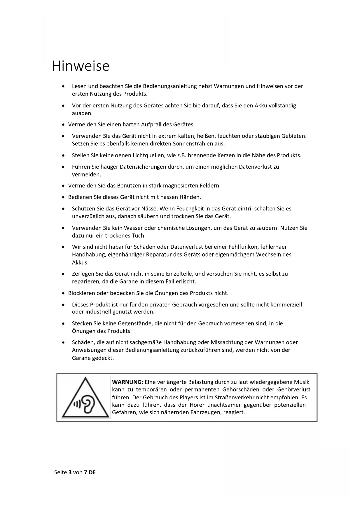 - 6. Technische Daten Seite 3 von 7 DE Hinweise Lesen und beachten Sie die Bedienungsanleitung nebst Warnungen und Hinweisen vor der ersten Nutzung des Produkts. Vor der ersten Nutzung des Gerätes achten Sie bitte darauf, dass Sie den Akku vollständig aufladen. Vermeiden Sie einen harten Aufprall des Gerätes. Verwenden Sie das Gerät nicht in extrem kalten, heißen, feuchten oder staubigen Gebieten. Setzen Sie es ebenfalls keinen direkten Sonnenstrahlen aus. Stellen Sie keine offenen Lichtquellen, wie z.B. brennende Kerzen in die Nähe des Produkts. Führen Sie häufiger Datensicherungen durch, um einen möglichen Datenverlust zu vermeiden. Vermeiden Sie das Benutzen in stark magnetisierten Feldern. Bedienen Sie dieses Gerät nicht mit nassen Händen. Schützen Sie das Gerät vor Nässe. Wenn Feuchtigkeit in das Gerät eintritt, schalten Sie es unverzüglich aus, danach säubern und trocknen Sie das Gerät. Verwenden Sie kein Wasser oder chemische Lösungen, um das Gerät zu säubern. Nutzen Sie dazu nur ein trockenes Tuch. Wir sind nicht haftbar für Schäden oder Datenverlust bei einer Fehlfunktion, fehlerhafter Handhabung, eigenhändiger Reparatur des Geräts oder eigenmächtigem Wechseln des Akkus. Zerlegen Sie das Gerät nicht in seine Einzelteile, und versuchen Sie nicht, es selbst zu reparieren, da die Garantie in diesem Fall erlischt. Blockieren oder bedecken Sie die Öffnungen des Produkts nicht. Dieses Produkt ist nur für den privaten Gebrauch vorgesehen und sollte nicht kommerziell oder industriell genutzt werden. Stecken Sie keine Gegenstände, die nicht für den Gebrauch vorgesehen sind, in die Öffnungen des Produkts. Schäden, die auf nicht sachgemäße Handhabung oder Missachtung der Warnungen oder Anweisungen dieser Bedienungsanleitung zurückzuführen sind, werden nicht von der Garantie gedeckt. WARNUNG: Eine verlängerte Belastung durch zu laut wiedergegebene Musik kann zu temporären oder permanenten Gehörschäden oder Gehörverlust führen. Der Gebrauch des Players ist im Straßenverkehr nicht empfohlen. Es kann dazu führen, dass der Hörer unachtsamer gegenüber potenziellen Gefahren, wie sich nähernden Fahrzeugen, reagiert.Seite 4 von 7 DE p. 7