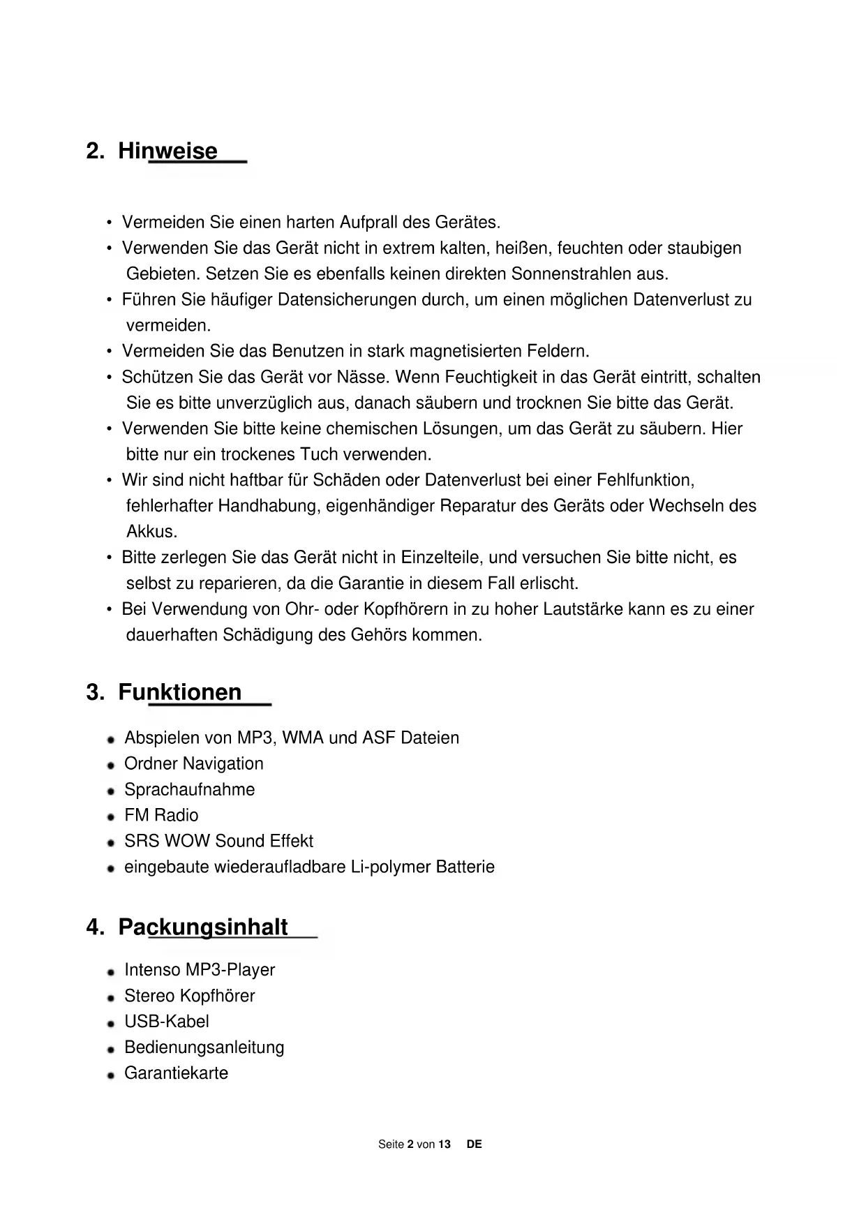 Intenso MP3-Player Stereo Kopfhörer USB-Kabel Bedienungsanleitung GarantiekarteSeite 3 von 13 DE
