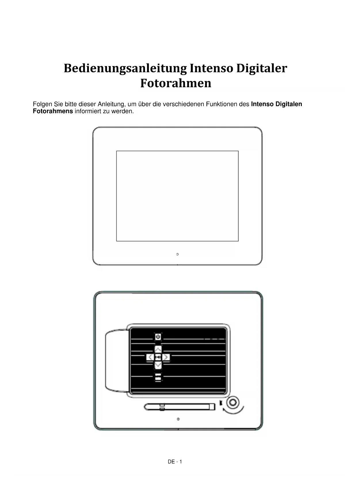 V1.1DE - 1 Bedienungsanleitung Intenso Digitaler Fotorahmen Folgen Sie bitte dieser Anleitung, um über die verschiedenen Funktionen des Intenso Digitalen Fotorahmens informiert zu werden.DE - 2