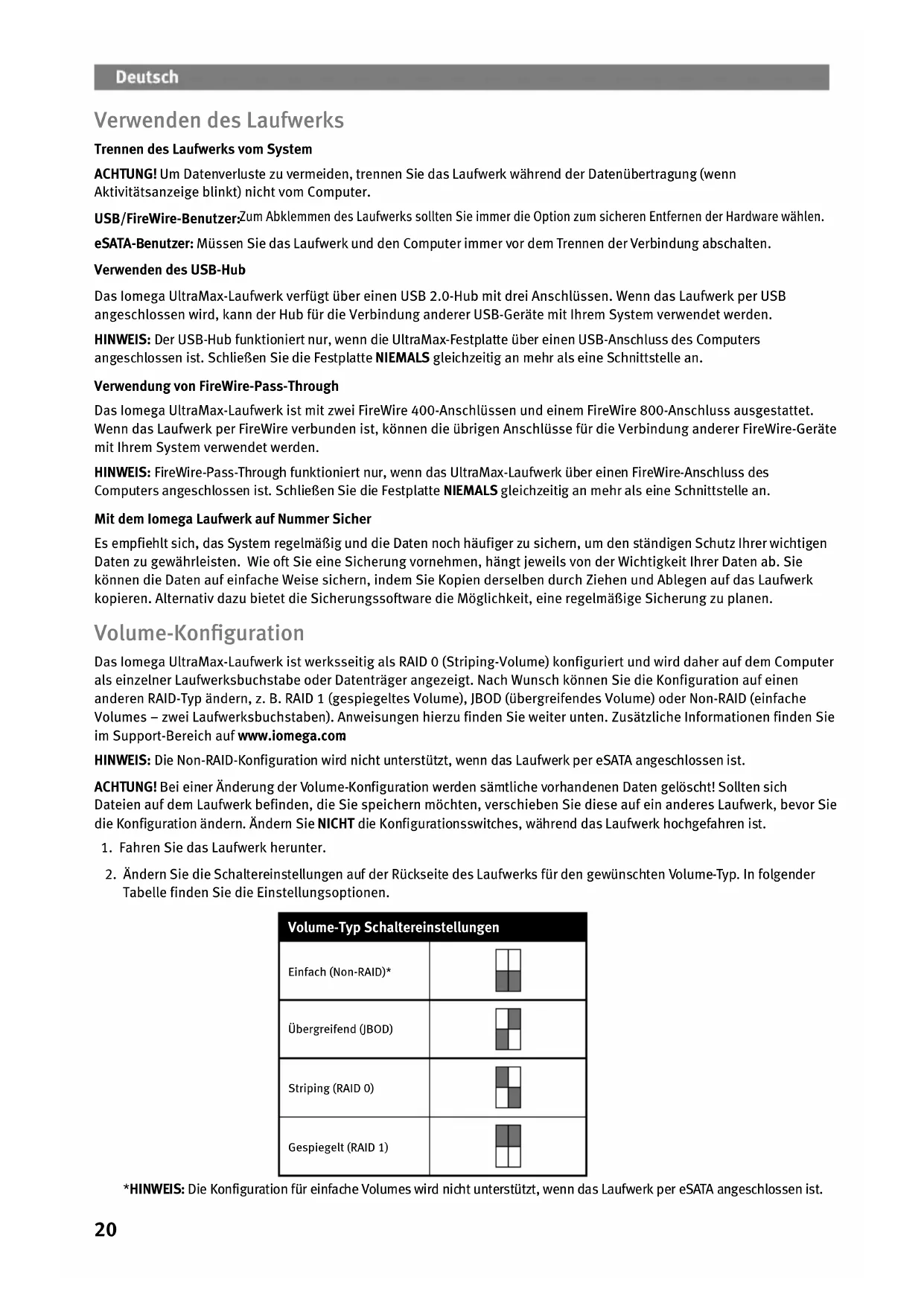 L’ordinateur ne démarre pas Si votre PC ne démarre pas lorsque le disque est connecté, il est possible que le BIOS de votre ordinateur rencontre des problèmes avec les disques amovibles de grande capacité. Afin de résoudre ce problème, éteignez le disque lorsque vous démarrez l’ordinateur. Allumez-le une fois l’ordinateur démarré. Guide complet de l’utilisateur Un guide de l’utilisateur complet est disponible au format HTML dans la section Support du site www.iomega.com.20 Verwenden des Laufwerks Trennen des Laufwerks vom System ACHTUNG! Um Datenverluste zu vermeiden, trennen Sie das Laufwerk während der Datenübertragung (wenn Aktivitätsanzeige blinkt) nicht vom Computer. USB/FireWire-Benutzer: Zum Abklemmen des Laufwerks sollten Sie immer die Option zum sicheren Entfernen der Hardware wählen. eSATA-Benutzer: Müssen Sie das Laufwerk und den Computer immer vor dem Trennen der Verbindung abschalten. Verwenden des USB-Hub Das Iomega UltraMax-Laufwerk verfügt über einen USB 2.0-Hub mit drei Anschlüssen. Wenn das Laufwerk per USB angeschlossen wird, kann der Hub für die Verbindung anderer USB-Geräte mit Ihrem System verwendet werden. HINWEIS: Der USB-Hub funktioniert nur, wenn die UltraMax-Festplatte über einen USB-Anschluss des Computers angeschlossen ist. Schließen Sie die Festplatte NIEMALS gleichzeitig an mehr als eine Schnittstelle an. Verwendung von FireWire-Pass-Through Das Iomega UltraMax-Laufwerk ist mit zwei FireWire 400-Anschlüssen und einem FireWire 800-Anschluss ausgestattet. Wenn das Laufwerk per FireWire verbunden ist, können die übrigen Anschlüsse für die Verbindung anderer FireWire-Geräte mit Ihrem System verwendet werden. HINWEIS: FireWire-Pass-Through funktioniert nur, wenn das UltraMax-Laufwerk über einen FireWire-Anschluss des Computers angeschlossen ist. Schließen Sie die Festplatte NIEMALS gleichzeitig an mehr als eine Schnittstelle an. Mit dem Iomega Laufwerk auf Nummer Sicher Es empfiehlt sich, das System regelmäßig und die Daten noch häufiger zu sichern, um den ständigen Schutz Ihrer wichtigen Daten zu gewährleisten. Wie oft Sie eine Sicherung vornehmen, hängt jeweils von der Wichtigkeit Ihrer Daten ab. Sie können die Daten auf einfache Weise sichern, indem Sie Kopien derselben durch Ziehen und Ablegen auf das Laufwerk kopieren. Alternativ dazu bietet die Sicherungssoftware die Möglichkeit, eine regelmäßige Sicherung zu planen. Volume-Konfiguration Das Iomega UltraMax-Laufwerk ist werksseitig als RAID 0 (Striping-Volume) konfiguriert und wird daher auf dem Computer als einzelner Laufwerksbuchstabe oder Datenträger angezeigt. Nach Wunsch können Sie die Konfiguration auf einen anderen RAID-Typ ändern, z. B. RAID 1 (gespiegeltes Volume), JBOD (übergreifendes Volume) oder Non-RAID (einfache Volumes – zwei Laufwerksbuchstaben). Anweisungen hierzu finden Sie weiter unten. Zusätzliche Informationen finden Sie im Support-Bereich auf www.iomega.com