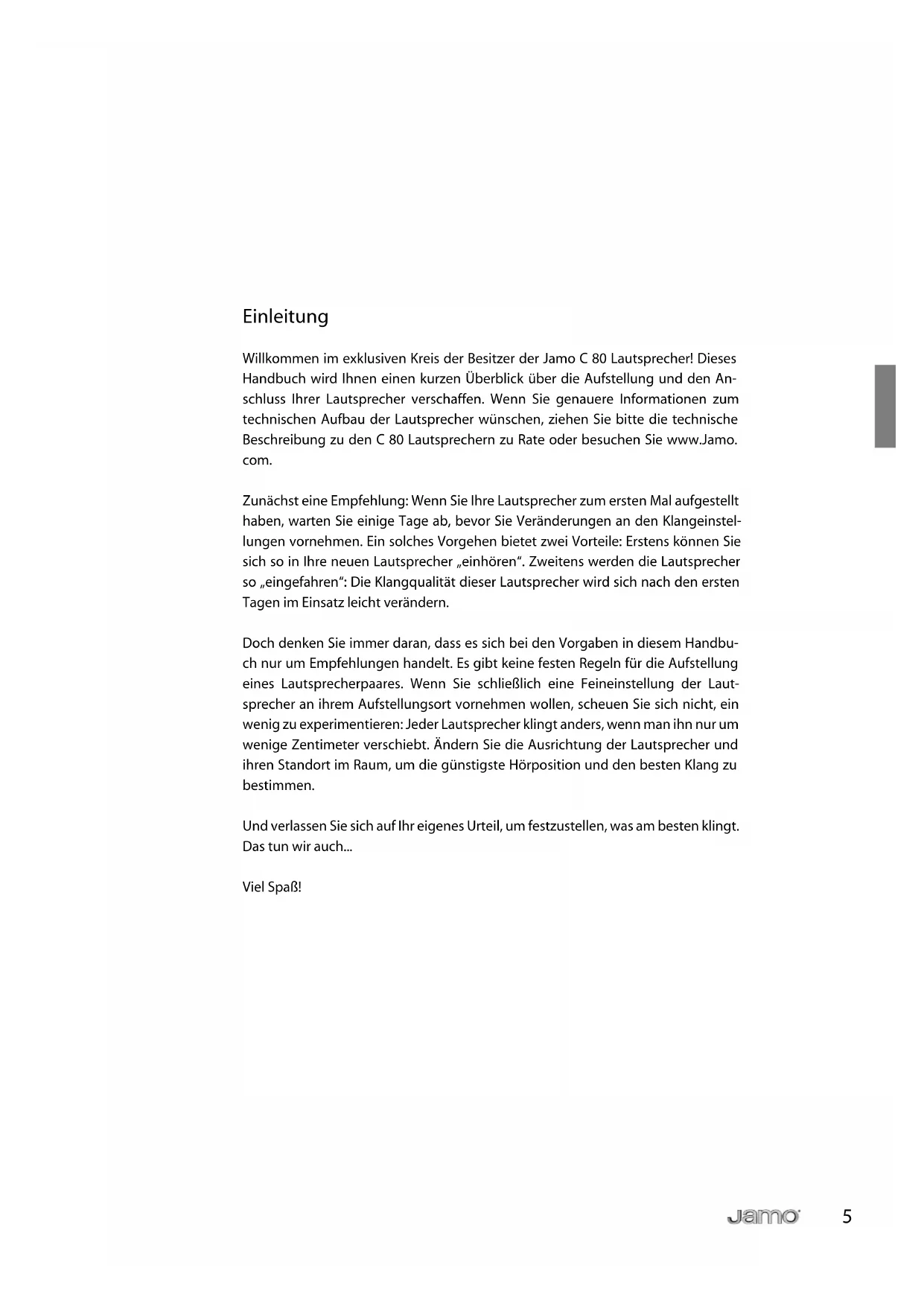 - Jamo consumer warranty deutsch5 Einleitung Willkommen im exklusiven Kreis der Besitzer der Jamo C 80 Lautsprecher! Dieses Handbuch wird Ihnen einen kurzen Überblick über die Aufstellung und den An- schluss Ihrer Lautsprecher verschaffen. Wenn Sie genauere Informationen zum technischen Aufbau der Lautsprecher wünschen, ziehen Sie bitte die technische Beschreibung zu den C 80 Lautsprechern zu Rate oder besuchen Sie www.Jamo. com. Zunächst eine Empfehlung: Wenn Sie Ihre Lautsprecher zum ersten Mal aufgestellt haben, warten Sie einige Tage ab, bevor Sie Veränderungen an den Klangeinstel- lungen vornehmen. Ein solches Vorgehen bietet zwei Vorteile: Erstens können Sie sich so in Ihre neuen Lautsprecher „einhören“. Zweitens werden die Lautsprecher so „eingefahren“: Die Klangqualität dieser Lautsprecher wird sich nach den ersten Tagen im Einsatz leicht verändern. Doch denken Sie immer daran, dass es sich bei den Vorgaben in diesem Handbu- ch nur um Empfehlungen handelt. Es gibt keine festen Regeln für die Aufstellung eines Lautsprecherpaares. Wenn Sie schließlich eine Feineinstellung der Laut- sprecher an ihrem Aufstellungsort vornehmen wollen, scheuen Sie sich nicht, ein wenig zu experimentieren: Jeder Lautsprecher klingt anders, wenn man ihn nur um wenige Zentimeter verschiebt. Ändern Sie die Ausrichtung der Lautsprecher und ihren Standort im Raum, um die günstigste Hörposition und den besten Klang zu bestimmen. Und verlassen Sie sich auf Ihr eigenes Urteil, um festzustellen, was am besten klingt. Das tun wir auch Viel Spaß!6 Allgemeine Tipps zum Aufstellen der Lautsprecher Stereodreieck Bei der Platzierung Ihrer Lautsprecher können Sie zunächst einmal das Stereodrei- eck zugrunde legen. Das bedeutet, dass der Abstand zwischen den Lautsprechern genauso groß sein sollte wie der Abstand zwischen der Hörposition und jeweils einem Lautsprecher. Mit anderen Worten sollten die Lautsprecher und die Hörposi- tion ein gleichschenkliges Dreieck bilden. Dämpfung Wenn Ihr Raum p. 21