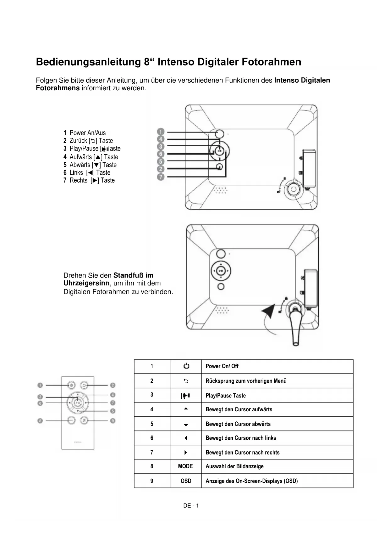 V1.0DE - 1 Bedienungsanleitung 8“ Intenso Digitaler Fotorahmen Folgen Sie bitte dieser Anleitung, um über die verschiedenen Funktionen des Intenso Digitalen Fotorahmens informiert zu werden.