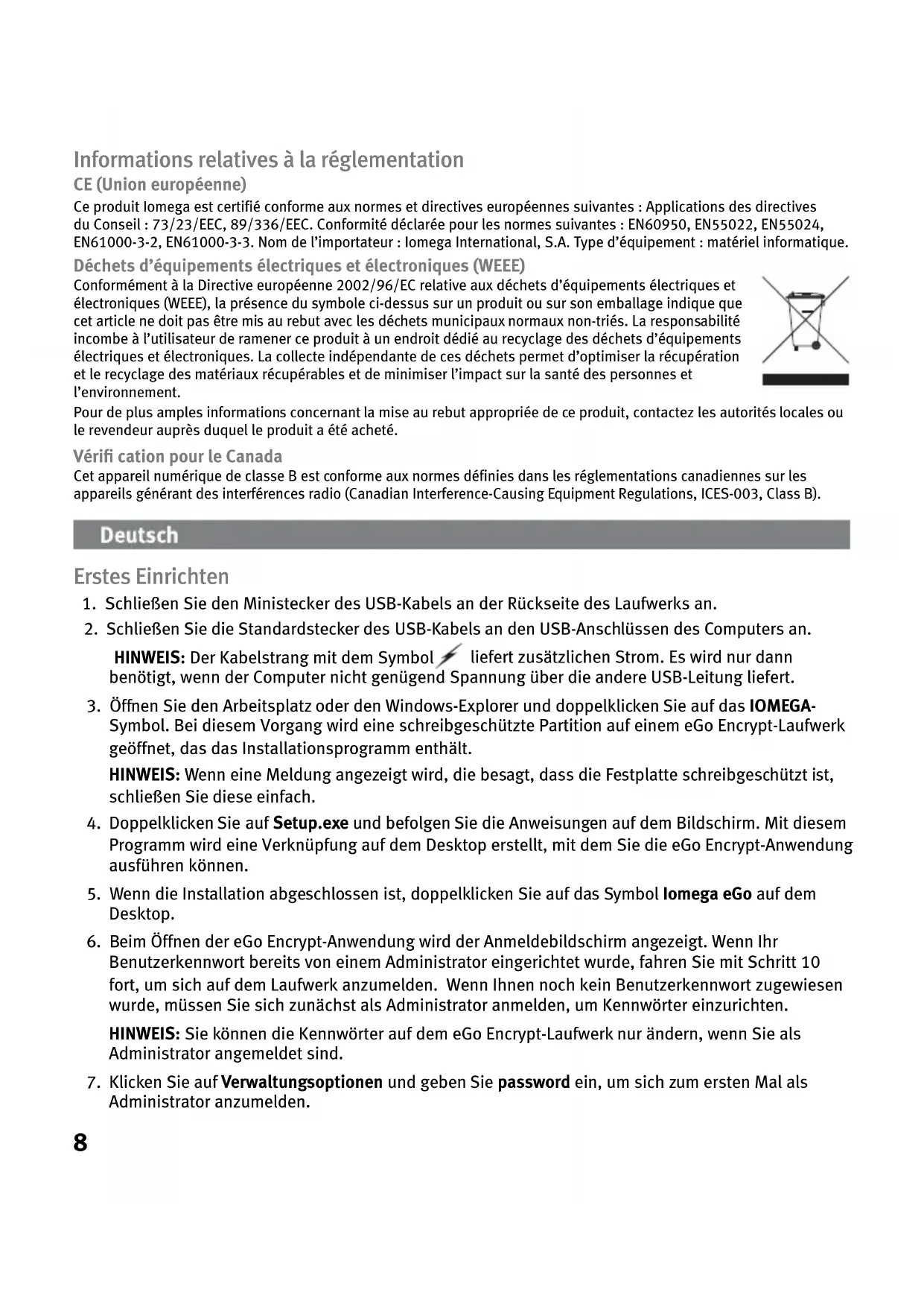 - Verwenden Sie andere USB-Anschlüsse, sofern auf dem Computer vorhanden. Wenn das IOMEGA-Symbol angezeigt wird, jedoch kein Symbol für die Iomega HDD-Datenpartition, doppelklicken Sie auf das Symbol Iomega eGo auf dem Desktop und geben Sie das Benutzerkennwort ein, um das Laufwerk zu entsperren. Die Iomega HDD-Partition ist nur sichtbar, wenn Sie als Benutzer angemeldet sind. Wenn das Problem weiterhin besteht, erhalten Sie im Supportbereich von www.iomega.com zusätzliche Hilfe zur Fehlerbehebung. Laufwerk verwenden Benutzerzugriff Wenn Sie als Benutzer angemeldet sind, haben Sie Zugriff auf die Iomega HDD-Partition auf dem eGo Encrypt-Laufwerk. Dies ermöglicht Ihnen die Anzeige, Änderung und Erstellung von Dateien auf der Datenpartition. Mit der Benutzeranmeldung haben Sie keinen Zugriff zur Änderung von Kennwörtern oder zur sicheren Löschung des Laufwerks. Melden Sie sich stets ab, wenn Sie das Laufwerk nicht verwenden, um die Sicherheit Ihrer Daten zu gewährleisten. Wenn Sie die USB-Verbindung trennen möchten, melden Sie sich zunächst ab und wenden Sie dann den Vorgang zum sicheren Entfernen des Laufwerks an, der für Ihr Betriebssystem zutreffend ist.10 ACHTUNG! Um Datenverluste zu vermeiden, trennen Sie das Laufwerk während der Datenübertragung nicht vom Computer (wenn Aktivitätsanzeige blinkt). Administratorzugriff Der Laufwerkadministrator kann sowohl das Administratorkennwort als auch die Benutzerkennwörter einrichten oder ändern. Der Administrator kann ebenfalls einen sicheren Löschvorgang vornehmen, bei dem sämtliche auf dem Laufwerk gespeicherte Daten zerstört werden. Mit der Administratoranmeldung haben Sie keinen Zugriff die Datenpartition des Laufwerks. Sicheres Löschen Das sichere Löschen ist ein unumkehrbarer Vorgang, bei dem sämtliche auf der Iomega HDD- Datenpartition gespeicherten Daten zerstört werden. Sie müssen als Administrator angemeldet sein, um einen sicheren Löschvorgang auszuführen. Nach Ausführen eines sicheren Löschvorgangs muss die Datenpartition mit einem NTFS-Dateisystem formatiert werden. Sie müssen sich als Administrator abmelden und als Benutzer anmelden, um die Datenpartition formatieren zu können. Ausführliche Anweisungen hierzu finden Sie im HTML-Benutzerhandbuch. Benutzerhandbuch (vollständig) Im Bereich „Support“ unter www.iomega.com steht Ihnen ein vollständiges Benutzerhandbuch im HTML- Format zur Verfügung. Eingeschränkte Garantie Iomega garantiert, dass dieses Hardwareprodukt während des Garantiezeitraums keine Material- oder Herstellungsfehler aufweist. Diese nicht übertragbare, eingeschränkte Garantie gilt ausschließlich für Sie als ersten Käufer sowie Endnutzer dieses Produkts. Der Garantiezeitraum beginnt mit dem Erwerbsdatum und hat für folgenden Zeitraum Gültigkeit: ein (1) Jahr für Produkte, die in Nord-, Mittel- und Südamerika oder im asiatisch-pazifischen Raum erworben wurden; neunzig (90) Tage für alle bei Iomega überholten Produkte, die in diesen Regionen erworben wurden; zwei (2) Jahre für Produkte, die von Endverbrauchern in Europa, im Nahen Osten oder in Afrika erworben wurden. Kunden, die ihre neuen Produkte innerhalb von 90 Tagen nach dem Kauf unter www.iomegareg.com registrieren, erhalten eine Garantieverlängerung, sodass die Gesamtgarantie eine Dauer von drei (3) Jahren für alle Regionen abdeckt. HINWEIS: Überholte Produkte sind nicht zulässig für eine Garantieverlängerung. Von dieser Garantie sind ausgenommen: (a) Iomega-Softwareprodukte; (b) Verschleißteile wie Sicherungen oder Glühbirnen; bzw. (c) Drittanbieterprodukte, -Hardware oder -Software, die im Lieferumfang des Produkts enthalten waren, auf das sich die Garantie bezieht. Iomega übernimmt hinsichtlich dieser Art von Produkten keinerlei Garantie. Falls diese im Lieferumfang enthalten sind, werden sie mit Abbedingen der Haftung für einen bestimmten Zweck zur Verfügung gestellt. Ausgenommen sind Schäden, die durch Unfall, Zweckentfremdung, unsachgemäße Verwendung, Verwendung von Medien, die nicht von Iomega zur Verfügung gestellt oder anerkannt wurden, Kontakt der Medien mit übermäßig starken Magnetfeldern oder Umwelteinflüssen verursacht wurden. Ihr einziges und ausschließliches Rechtsmittel im Falle eines abgedeckten Defekts ist die Reparatur bzw. der Ersatz des defekten Produkts; die diesbezügliche Entscheidung sowie die anfallenden Kosten liegen ausschließlich bei Iomega (abgesehen von evtl. anfallenden Frachtkosten). Iomega kann hierzu neue oder gebrauchte Teile oder Produkte verwenden. Für das ersetzte Teil/Produkt wird für den Rest der ursprünglichen Garantiefrist oder für drei (3) Monate ab Versanddatum solcher Teile/Produkte Garantie geleistet, je nachdem, welcher Zeitraum länger ist. Falls die Reparatur bzw. der Ersatz eines defekten Produkts durch Iomega nicht möglich ist, ist Ihr einziges alternatives Rechtsmittel die Erstattung des ursprünglichen Kaufpreises. Die obigen Angaben stellen sämtliche Verpflichtungen dar, die Iomega Ihnen gegenüber im Rahmen dieser Garantie hat. IOMEGA IST UNTER KEINEN UMSTÄNDEN HAFTBAR FÜR MITTELBARE SCHÄDEN, SCHADENSERSATZ FÜR AUFWENDUNGEN BEI VERTRAGSERFÜLLUNG, FOLGESCHÄDEN ODER SPEZIELLE SCHÄDEN BZW. VERLUSTE, EINSCHLIESSLICH DATENVERLUST, NUTZUNGSAUSFALL SOWIE BETRIEBSUNTERBRECHUNG, SELBST WENN IOMEGA AUF DIE MÖGLICHKEIT SOLCHER SCHÄDEN HINGEWIESEN WURDE. Die Haftung von Iomega übersteigt keinesfalls den ursprünglichen Kaufpreis des jeweiligen Laufwerks oder Datenträgers. Gemäß einiger Rechtsprechungen ist der11 Ausschluss bzw. die Einschränkung von Schadensersatz für Aufwendungen bei Vertragserfüllung bzw. Folgeschäden nicht zulässig, sodass die oben genannten Ausschluss- bzw. Einschränkungsklauseln für Sie möglicherweise nicht relevant sind. Inanspruchnahme des Garantieservice Um den Garantieservice in Anspruch nehmen zu können, müssen Sie Iomega innerhalb der Garantiefrist benachrichtigen. Die spezifischen Kundendi