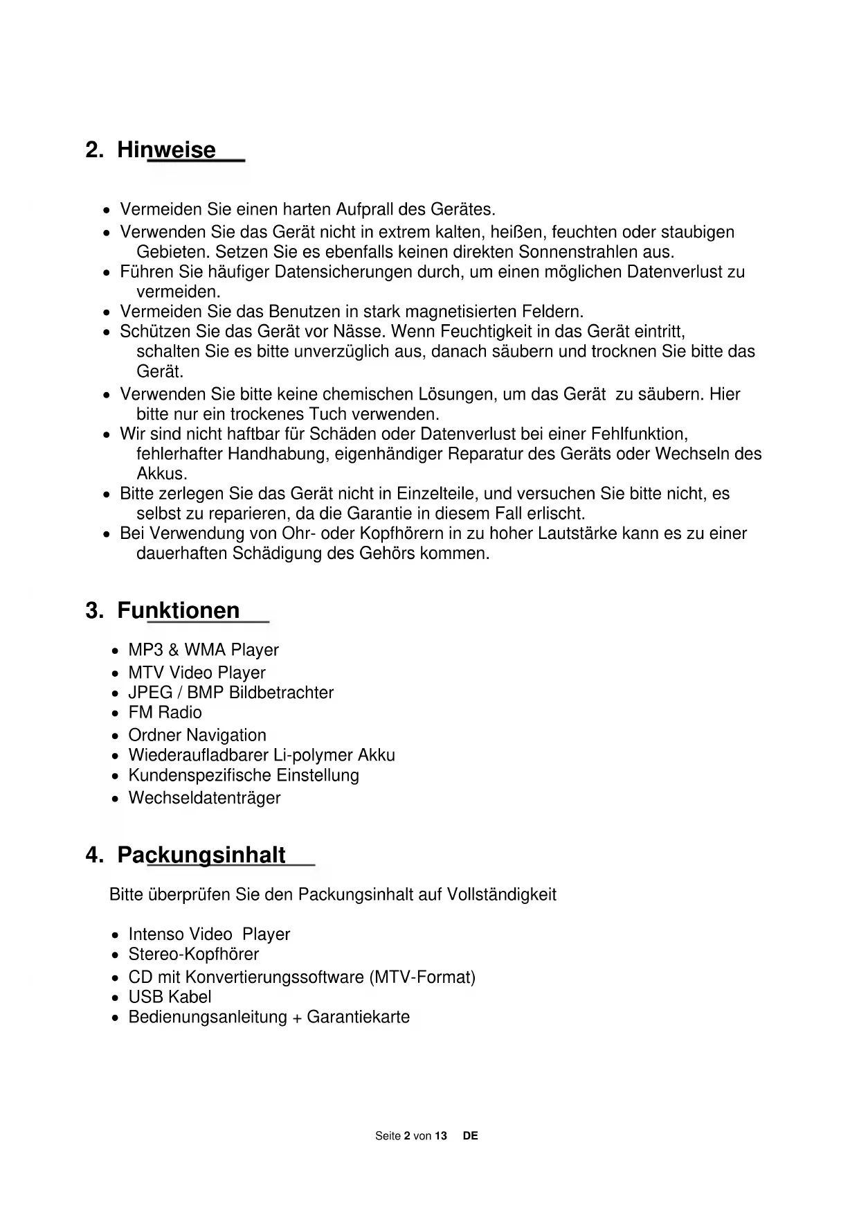 Bitte überprüfen Sie den Packungsinhalt auf Vollständigkeit Intenso Video Player Stereo-Kopfhörer CD mit Konvertierungssoftware (MTV-Format) USB Kabel Bedienungsanleitung + GarantiekarteSeite 3 von 13 DE