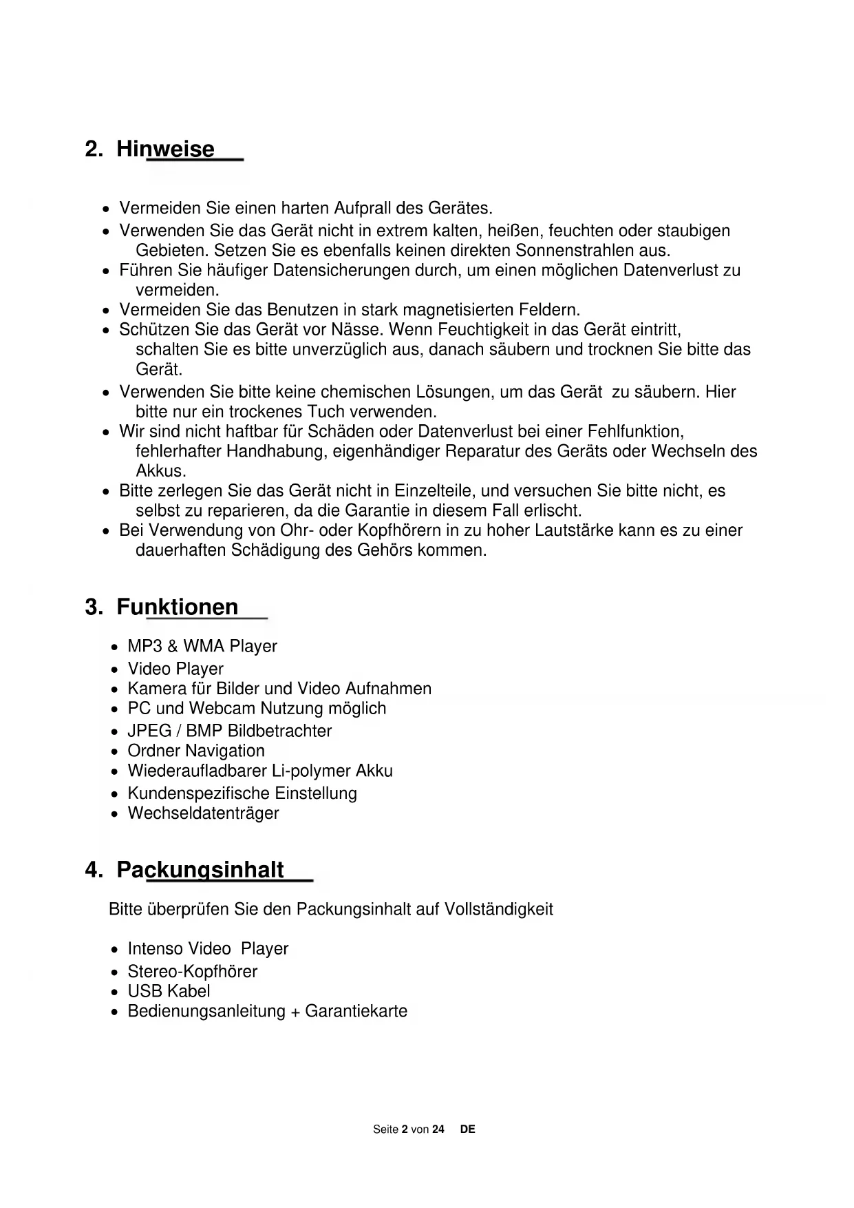 Bitte überprüfen Sie den Packungsinhalt auf Vollständigkeit Intenso Video Player Stereo-Kopfhörer USB Kabel Bedienungsanleitung + GarantiekarteSeite 3 von 24 DE
