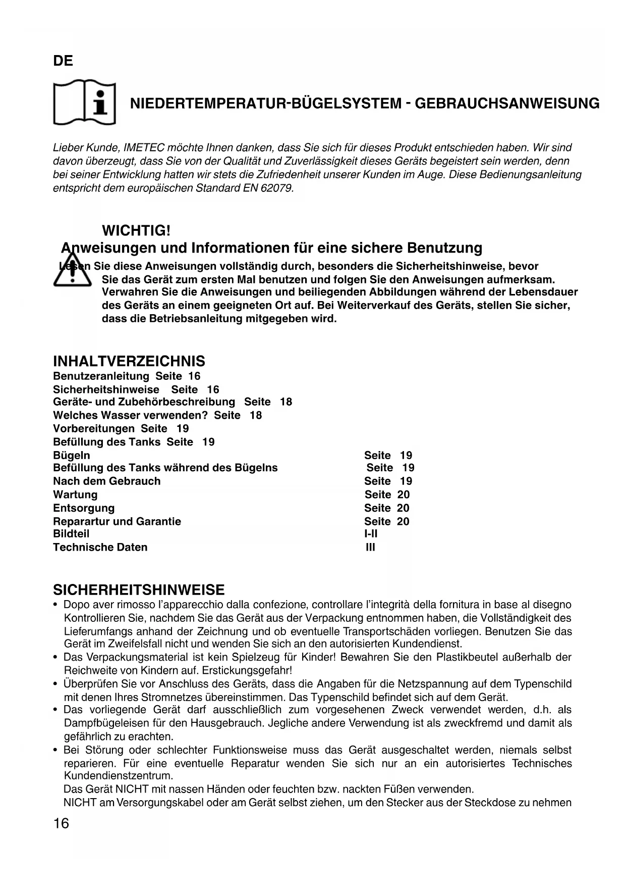 DE NIEDERTEMPERATURBÜGELSYSTEM GEBRAUCHSANWEISUNG Lieber Kunde, IMETEC möchte Ihnen danken, dass Sie sich für dieses Produkt entschieden haben. Wir sind