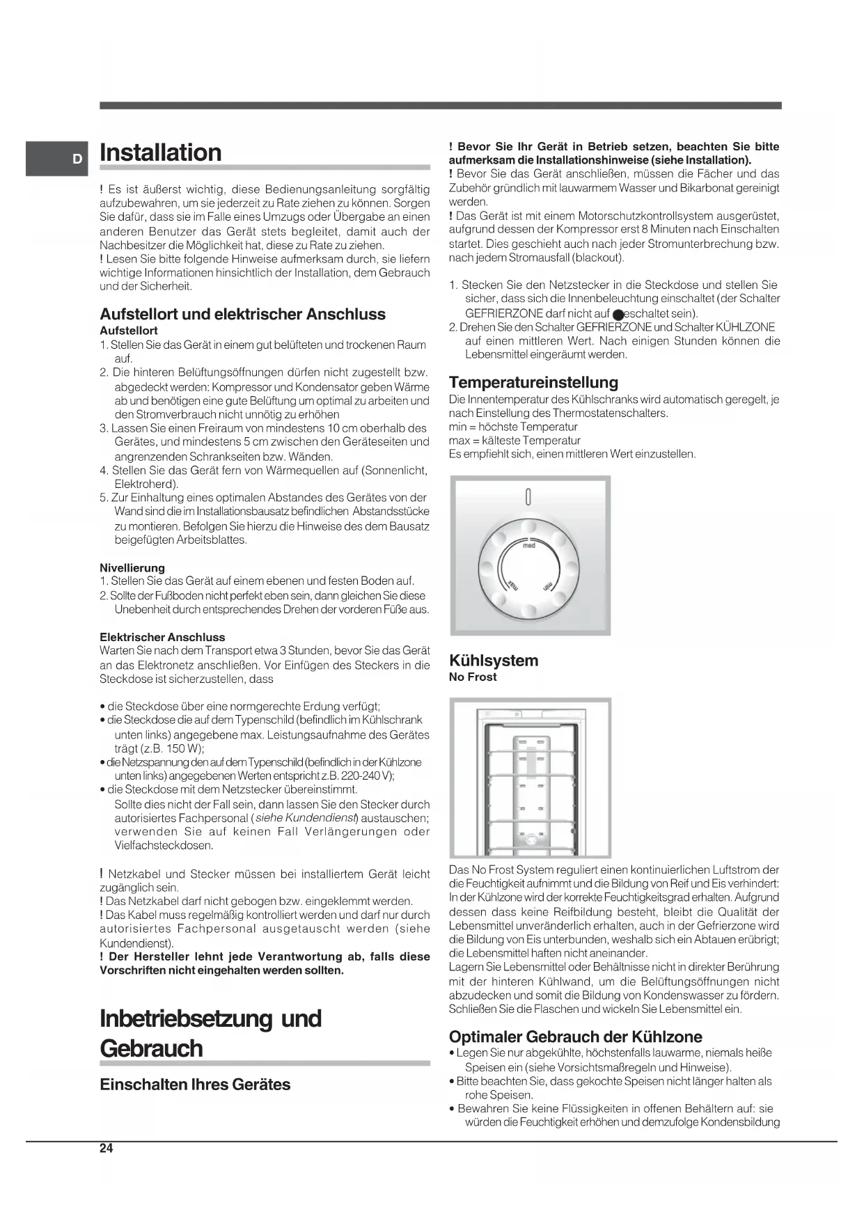 ! ! ! Lesen Sie bitte folgende Hinweise aufmerksam durch, sie liefernwichtige Informationen hinsichtlich der Installation, dem Gebrauchund der Sicherheit. Aufstellort und elektrischer Anschluss Aufstellort1. Stellen Sie das Gerät in einem gut belüfteten und trockenen Raum auf. 2. Die hinteren Belüftungsöffnungen dürfen nicht zugestellt bzw.abgedeckt werden: Kompressor und Kondensator geben Wärmeab und benötigen eine gute Belüftung um optimal zu arbeiten undden Stromverbrauch nicht unnötig zu erhöhen3. Lassen Sie einen Freiraum von mindestens 10 cm oberhalb desGerätes, und mindestens 5 cm zwischen den Geräteseiten undangrenzenden Schrankseiten bzw. Wänden.4. Stellen Sie das Gerät fern von Wärmequellen auf (Sonnenlicht,Elektroherd).5. Zur Einhaltung eines optimalen Abstandes des Gerätes von derWand sind die im Installationsbausatz befindlichen Abstandsstückezu montieren. Befolgen Sie hierzu die Hinweise des dem Bausatzbeigefügten Arbeitsblattes.Nivellierung1. Stellen Sie das Gerät auf einem ebenen und festen Boden auf.2. Sollte der Fußboden nicht perfekt eben sein, dann gleichen Sie dieseUnebenheit durch entsprechendes Drehen der vorderen Füße aus.Elektrischer AnschlussWarten Sie nach dem Transport etwa 3 Stunden, bevor Sie das Gerätan das Elektronetz anschließen. Vor Einfügen des Steckers in dieSteckdose ist sicherzustellen, dass• die Steckdose über eine normgerechte Erdung verfügt;• die Steckdose die auf dem Typenschild (befindlich im Kühlschrankunten links) angegebene max. Leistungsaufnahme des Gerätesträgt (z.B. 150 W);• die Netzspannung den auf dem Typenschild (befindlich in der Kühlzoneunten links) angegebenen Werten entspricht z.B. 220-240 V);• die Steckdose mit dem Netzstecker übereinstimmt.Sollte dies nicht der Fall sein, dann lassen Sie den Stecker durchautorisiertes Fachpersonal ( siehe Kundendienst ) austauschen;verwenden Sie auf keinen Fall Verlängerungen oderVielfachsteckdosen. ! !