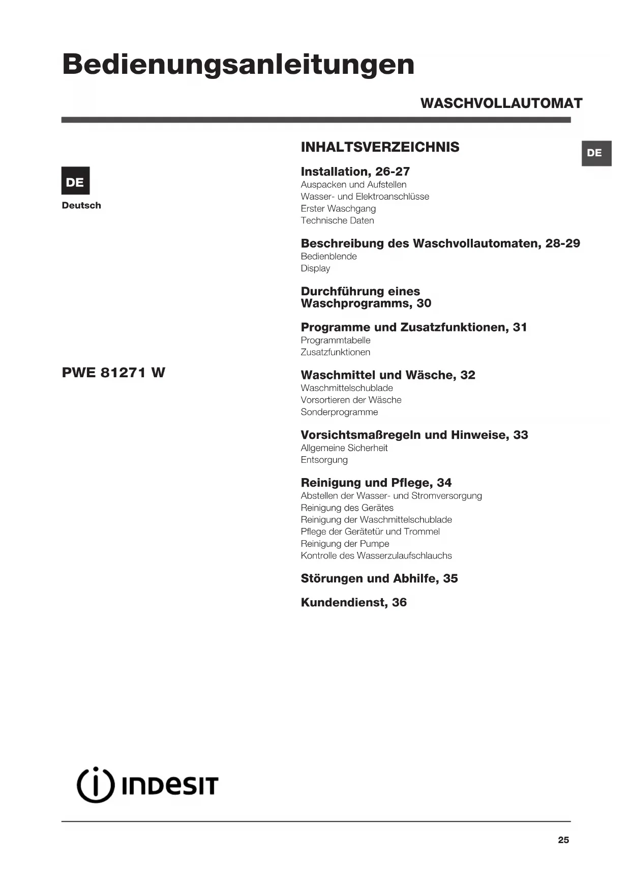 DE WASCHVOLLAUTOMAT INHALTSVERZEICHNIS Installation, 26-27