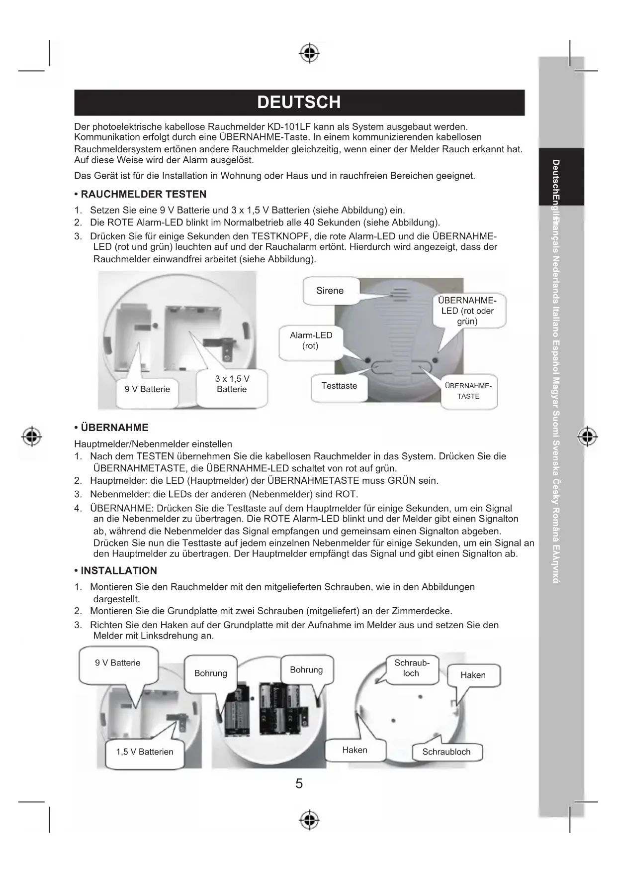 DEUTSCH Der photoelektrische kabellose Rauchmelder KD-101LF kann als System ausgebaut werden. Kommunikation erfolgt durch eine ÜBERNAHME-Taste. In einem kommunizierenden kabellosen Rauchmeldersystem ertönen andere Rauchmelder gleichzeitig, wenn einer der Melder Rauch erkannt hat. Auf diese Weise wird der Alarm ausgelöst. Das Gerät ist für die Installation in Wohnung oder Haus und in rauchfreien Bereichen geeignet.