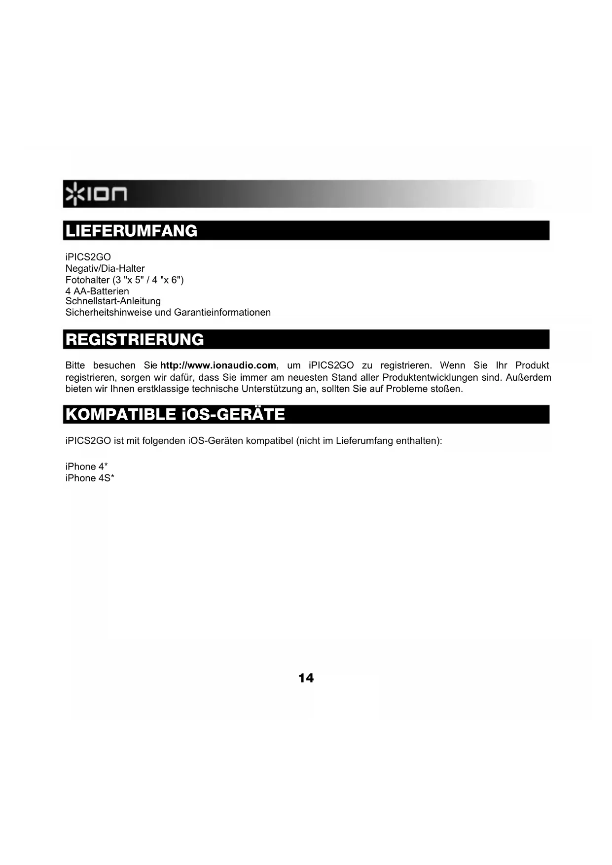 LIEFERUMFANG iPICS2GO Negativ/Dia-Halter Fotohalter (3 "x 5" / 4 "x 6") 4 AA-Batterien Schnellstart-Anleitung Sicherheitshinweise und Garantieinformationen REGISTRIERUNG Bitte besuchen Sie http://www.ionaudio.com, um iPICS2GO zu registrieren. Wenn Sie Ihr Produkt registrieren, sorgen wir dafür, dass Sie immer am neuesten Stand aller Produktentwicklungen sind. Außerdem bieten wir Ihnen erstklassige technische Unterstützung an, sollten Sie auf Probleme stoßen. KOMPATIBLE iOS-GERÄTE iPICS2GO ist mit folgenden iOS-Geräten kompatibel (nicht im Lieferumfang enthalten): iPhone 4* iPhone 4S*15 SO VERWENDEN SIE iPICS2GO