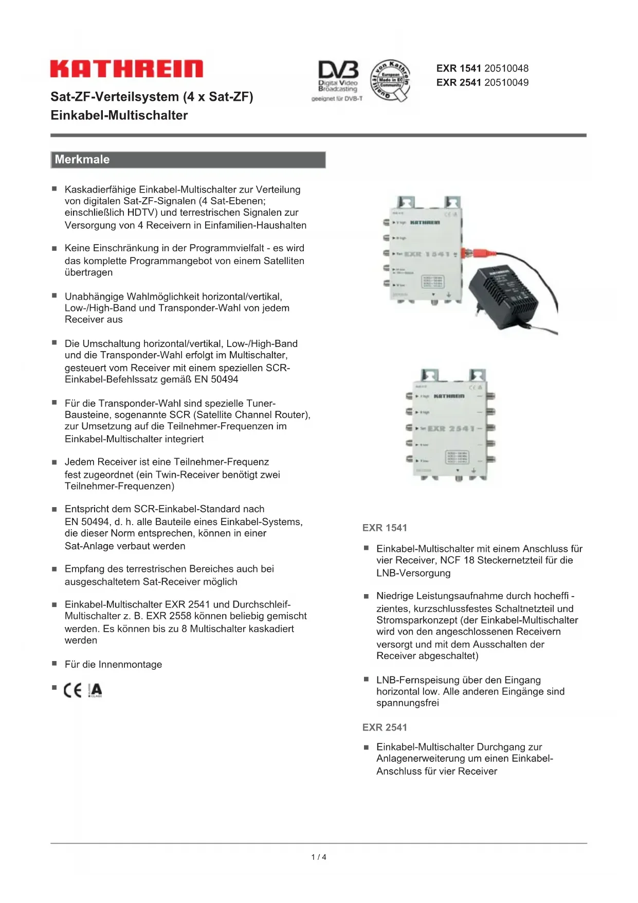 Kaskaderfähige Einkabel-Multischalter zur Verteilung von digitalen Sat-ZF-Signalen (4 Sat-Ebenen; einschließlich HDTV) und terrestrischen Signalen zur Versorgung von 4 Receivern in Einfamilien-Haushalten