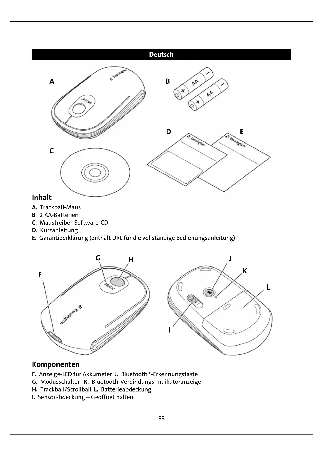 Die Verwendung des Symbols gibt an, dass dieses Produkt nicht als Hausmüll behandelt werden darf. Durch das Sicherstellen der korrekten Beseitigung dieses Produkts tragen Sie dazu bei, mögliche negative Auswirkungen auf die Umwelt und die Gesundheit von Menschen zu vermeiden, die anderenfalls bei ungeeigneter Beseitigung dieses Produkts hervorgerufen werden können. Detaillierte Informationen zur Wiederverwertung dieses Produkts erhalten Sie bei den örtlichen Behörden, bei dem für Ihren Wohnsitz zuständigen Wertstoffverwerter bzw. dem Geschäft, in dem Sie dieses Produkt erworben haben. Kensington und ACCO sind registrierte Handelsmarken von ACCO Brands. SlimBlade ist eine Handelsmarke von ACCO Brands. The Kensington Promise ist eine Servicemarke von ACCO Brands. Alle anderen Handelsmarken sind Eigentum der jeweiligen Unternehmen. Patente angemeldet. ©2007 Kensington Computer Products Group, ein Bereich von ACCO Brands. Die unerlaubte Vervielfältigung, Duplizierung oder eine andere Form der Reproduktion von Inhalten hieraus ist ohne schriftliche Genehmigung durch die Kensington Technology Group untersagt. Alle Rechte vorbehalten. 4/0749 Nederlands A B Inhoud A. Muis met trackball B. 2 AA-batterijen C. Cd met stuurprogrammasoftware voor de muis D. Snelstartgids E. Garantiebijlage (met URL voor volledige handleiding) Onderdelen F. Brandstofmeter net indicatielampjes J. Bluetooth® Discover-button G. Modusschakelaar K. Indicatielampje voor Bluetooth-verbinding H. Trackball/scrollball L. Batterijklepje