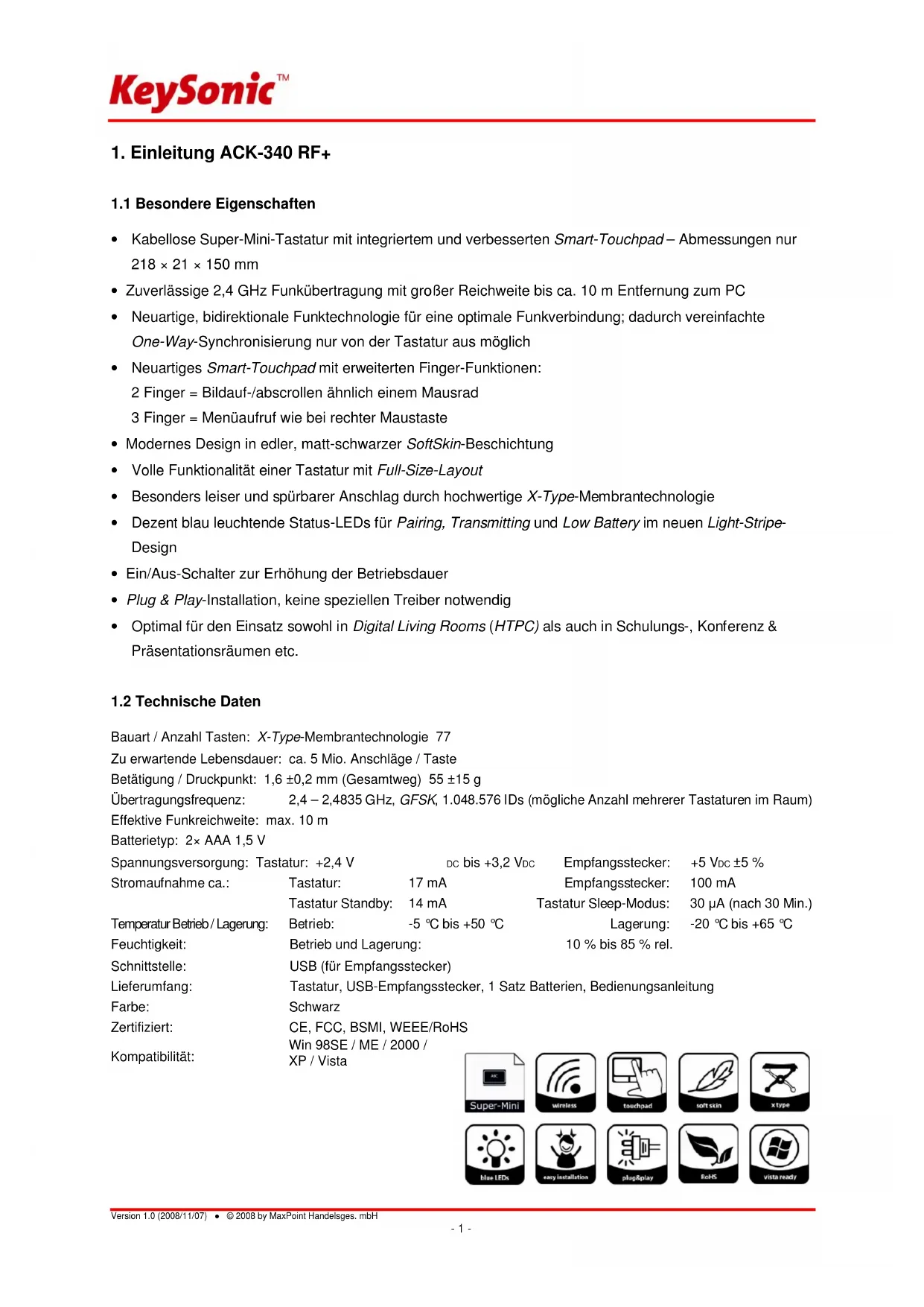 Bauart / Anzahl Tasten: X-Type-Membrantechnologie 77 Zu erwartende Lebensdauer: ca. 5 Mio. Anschläge / Taste Betätigung / Druckpunkt: 1,6 ±0,2 mm (Gesamtweg) 55 ±15 g Übertragungsfrequenz: 2,4 – 2,4835 GHz, GFSK, 1.048.576 IDs (mögliche Anzahl mehrerer Tastaturen im Raum) Effektive Funkreichweite: max. 10 m Batterietyp: 2× AAA 1,5 V Spannungsversorgung: Tastatur: +2,4 V