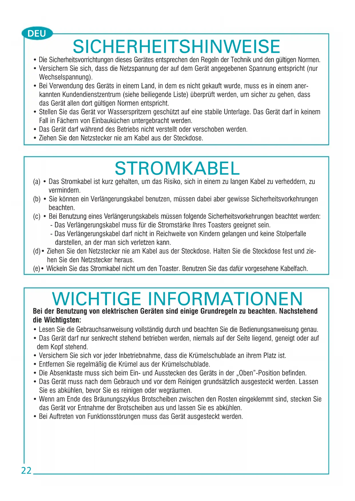 WICHTIGE INFORMATIONEN Bei der Benutzung von elektrischen Geräten sind einige Grundregeln zu beachten. Nachstehend