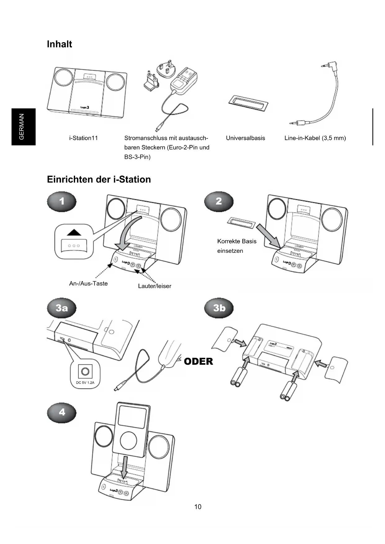 Netzstrom (3a) - Schließen Sie den DC-Stecker an der Rückseite der i-Station an (DC 5V). - Wählen sie den für Ihre Stromversorgung korrekten Adapterstecker, und schließen sie diesen an. - Stecken Sie den Stecker in die Steckdose und schalten Sie die Stromver- sorgung EIN. Batteriebetrieb (3b) - Entfernen Sie die Batteriefachabdeckungen. - Legen Sie 4 Batterien des Typs AA ein, und achten Sie auf die Polarität. - Setzen Sie die Batteriefachabdeckungen wieder ein. WARNUNG: Bitte stellen Sie sicher, dass die Batterien richtig eingelegt sind. Wenn die Bat- terien falsch eingelegt werden (mit umgekehrter Polarität), kann dies zu Verletzungen führen sowie auch Ihre i-Station beschädigen.