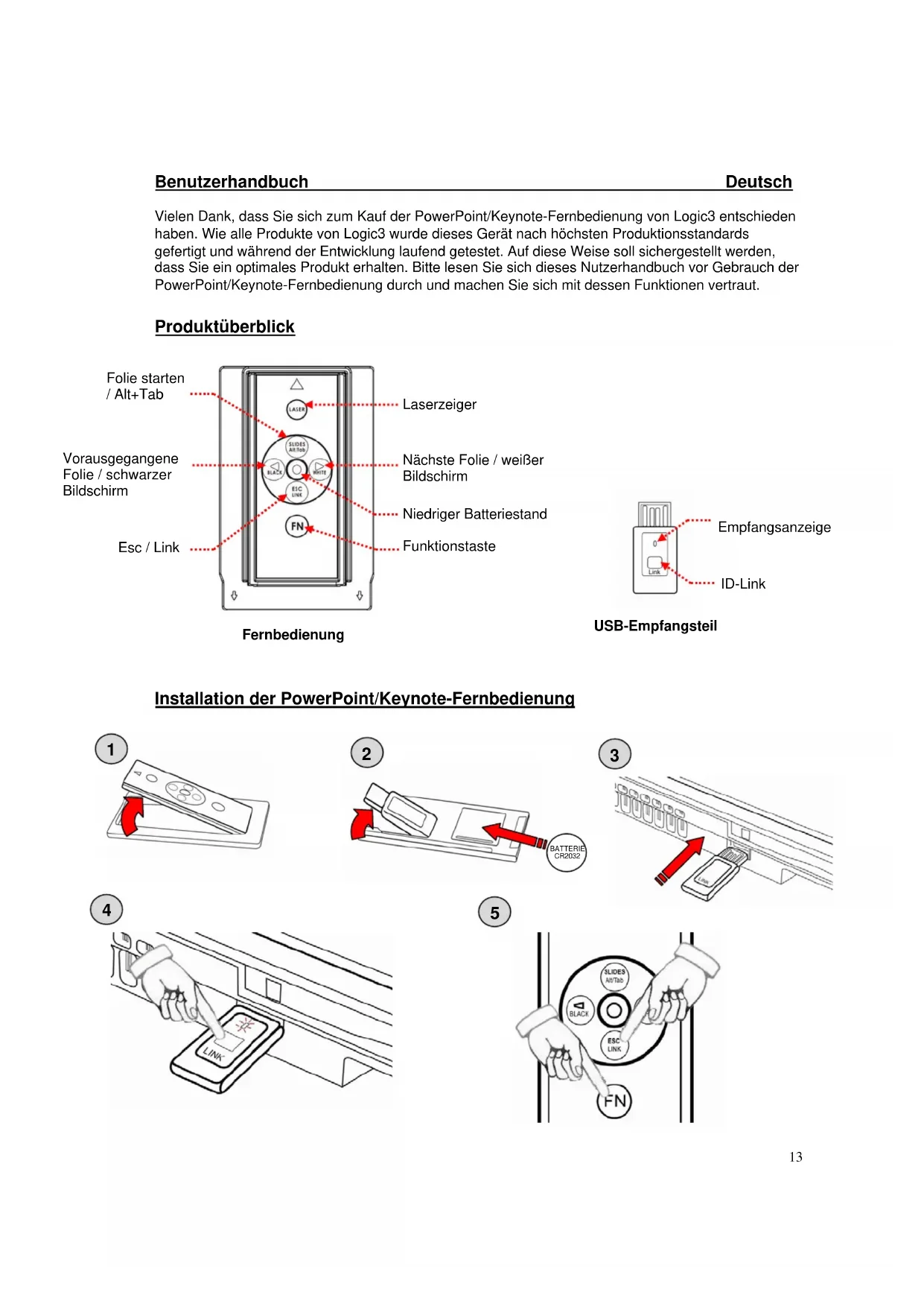 Benutzerhandbuch Deutsch Vielen Dank, dass Sie sich zum Kauf der PowerPoint/Keynote-Fernbedienung von Logic3 entschieden haben. Wie alle Produkte von Logic3 wurde dieses Gerät nach höchsten Produktionsstandards gefertigt und während der Entwicklung laufend getestet. Auf diese Weise soll sichergestellt werden, dass Sie ein optimales Produkt erhalten. Bitte lesen Sie sich dieses Nutzerhandbuch vor Gebrauch der PowerPoint/Keynote-Fernbedienung durch und machen Sie sich mit dessen Funktionen vertraut. Produktüberblick