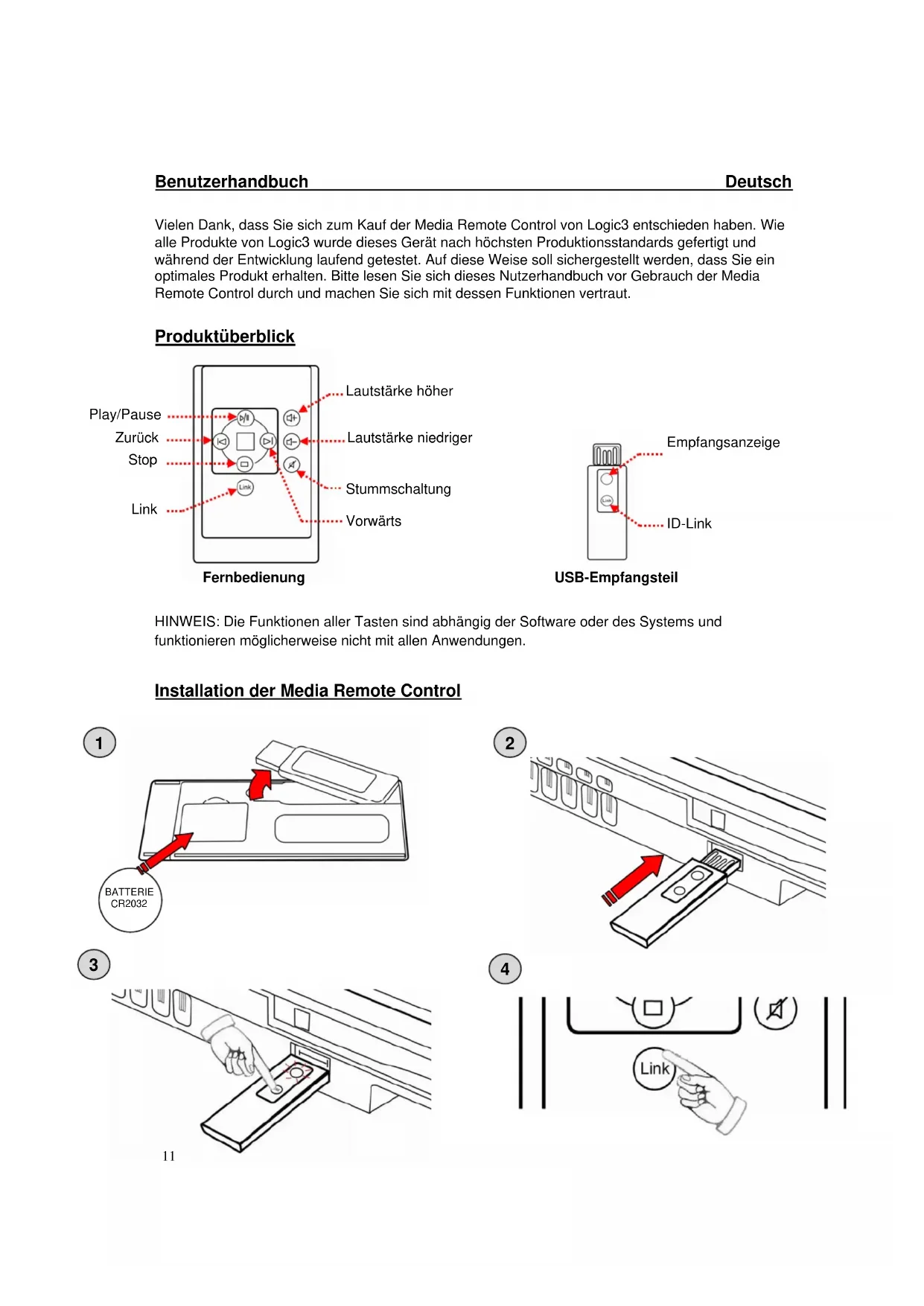 Vielen Dank, dass Sie sich zum Kauf der Media Remote Control von Logic3 entschieden haben. Wie alle Produkte von Logic3 wurde dieses Gerät nach höchsten Produktionsstandards gefertigt und während der Entwicklung laufend getestet. Auf diese Weise soll sichergestellt werden, dass Sie ein optimales Produkt erhalten. Bitte lesen Sie sich dieses Nutzerhandbuch vor Gebrauch der Media Remote Control durch und machen Sie sich mit dessen Funktionen vertraut. Produktüberblick
