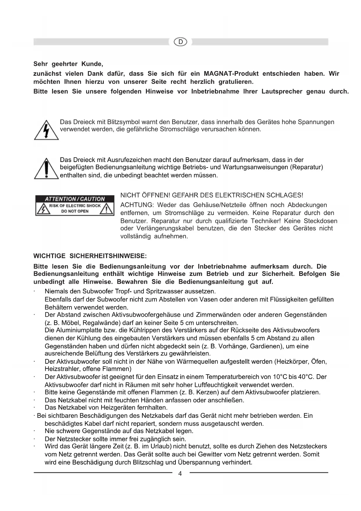 Sehr geehrter Kunde, zunächst vielen Dank dafür, dass Sie sich für ein MAGNAT-Produkt entschieden haben. Wir möchten Ihnen hierzu von unserer Seite recht herzlich gratulieren. Bitte lesen Sie unsere folgenden Hinweise vor Inbetriebnahme Ihrer Lautsprecher genau durch. Das Dreieck mit Blitzsymbol warnt den Benutzer, dass innerhalb des Gerätes hohe Spannungen verwendet werden, die gefährliche Stromschläge verursachen können. Das Dreieck mit Ausrufezeichen macht den Benutzer darauf aufmerksam, dass in der beigefügten Bedienungsanleitung wichtige Betriebs- und Wartungsanweisungen (Reparatur) enthalten sind, die unbedingt beachtet werden müssen. NICHT ÖFFNEN! GEFAHR DES ELEKTRISCHEN SCHLAGES! ACHTUNG: Weder das Gehäuse/Netzteile öffnen noch Abdeckungen entfernen, um Stromschläge zu vermeiden. Keine Reparatur durch den Benutzer. Reparatur nur durch qualifizierte Techniker! Keine Steckdosen oder Verlängerungskabel benutzen, die den Stecker des Gerätes nicht vollständig aufnehmen. WICHTIGE SICHERHEITSHINWEISE: Bitte lesen Sie die Bedienungsanleitung vor der Inbetriebnahme aufmerksam durch. Die Bedienungsanleitung enthält wichtige Hinweise zum Betrieb und zur Sicherheit. Befolgen Sie unbedingt alle Hinweise. Bewahren Sie die Bedienungsanleitung gut auf.