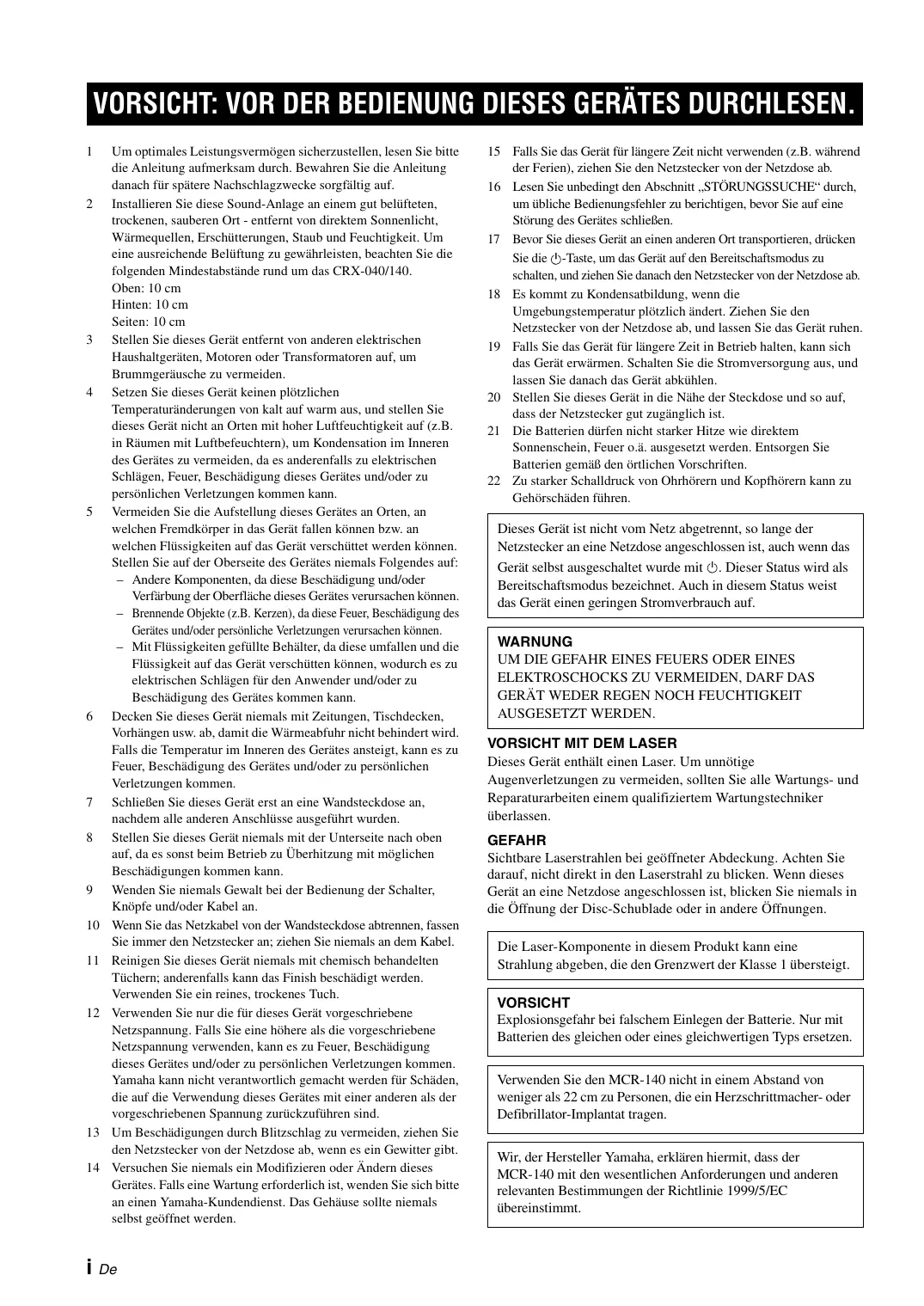 Um optimales Leistungsvermögen sicherzustellen, lesen Sie bitte die Anleitung aufmerksam durch. Bewahren Sie die Anleitung danach für spätere Nachschlagzwecke sorgfältig auf. Installieren Sie diese Sound-Anlage an einem gut belüfteten, trockenen, sauberen Ort - entfernt von direktem Sonnenlicht, Wärmequellen, Erschütterungen, Staub und Feuchtigkeit. Um eine ausreichende Belüftung zu gewährleisten, beachten Sie die folgenden Mindestabstände rund um das CRX-040/140. Oben: 10 cm Hinten: 10 cm Seiten: 10 cm Stellen Sie dieses Gerät entfernt von anderen elektrischen Haushaltgeräten, Motoren oder Transformatoren auf, um Brummgeräusche zu vermeiden. Setzen Sie dieses Gerät keinen plötzlichen Temperaturänderungen von kalt auf warm aus, und stellen Sie dieses Gerät nicht an Orten mit hoher Luftfeuchtigkeit auf (z.B. in Räumen mit Luftbefeuchtern), um Kondensation im Inneren des Gerätes zu vermeiden, da es anderenfalls zu elektrischen Schlägen, Feuer, Beschädigung dieses Gerätes und/oder zu persönlichen Verletzungen kommen kann. Vermeiden Sie die Aufstellung dieses Gerätes an Orten, an welchen Fremdkörper in das Gerät fallen können bzw. an welchen Flüssigkeiten auf das Gerät verschüttet werden können. Stellen Sie auf der Oberseite des Gerätes niemals Folgendes auf: – Andere Komponenten, da diese Beschädigung und/oder Verfärbung der Oberfläche dieses Gerätes verursachen können. – Brennende Objekte (z.B. Kerzen), da diese Feuer, Beschädigung des Gerätes und/oder persönliche Verletzungen verursachen können. – Mit Flüssigkeiten gefüllte Behälter, da diese umfallen und die Flüssigkeit auf das Gerät verschütten können, wodurch es zu elektrischen Schlägen für den Anwender und/oder zu Beschädigung des Gerätes kommen kann. Decken Sie dieses Gerät niemals mit Zeitungen, Tischdecken, Vorhängen usw. ab, damit die Wärmeabfuhr nicht behindert wird. Falls die Temperatur im Inneren des Gerätes ansteigt, kann es zu Feuer, Beschädigung des Gerätes und/oder zu persönlichen Verletzungen kommen. Schließen Sie dieses Gerät erst an eine Wandsteckdose an, nachdem alle anderen Anschlüsse ausgeführt wurden. Stellen Sie dieses Gerät niemals mit der Unterseite nach oben auf, da es sonst beim Betrieb zu Überhitzung mit möglichen Beschädigungen kommen kann. Wenden Sie niemals Gewalt bei der Bedienung der Schalter, Knöpfe und/oder Kabel an. Wenn Sie das Netzkabel von der Wandsteckdose abtrennen, fassen Sie immer den Netzstecker an; ziehen Sie niemals an dem Kabel. Reinigen Sie dieses Gerät niemals mit chemisch behandelten Tüchern; anderenfalls kann das Finish beschädigt werden. Verwenden Sie ein reines, trockenes Tuch. Verwenden Sie nur die für dieses Gerät vorgeschriebene Netzspannung. Falls Sie eine höhere als die vorgeschriebene Netzspannung verwenden, kann es zu Feuer, Beschädigung dieses Gerätes und/oder zu persönlichen Verletzungen kommen. Yamaha kann nicht verantwortlich gemacht werden für Schäden, die auf die Verwendung dieses Gerätes mit einer anderen als der vorgeschriebenen Spannung zurückzuführen sind. Um Beschädigungen durch Blitzschlag zu vermeiden, ziehen Sie den Netzstecker von der Netzdose ab, wenn es ein Gewitter gibt. Versuchen Sie niemals ein Modifizieren oder Ändern dieses Gerätes. Falls eine Wartung erforderlich ist, wenden Sie sich bitte an einen Yamaha-Kundendienst. Das Gehäuse sollte niemals selbst geöffnet werden. i De 15 Falls Sie das Gerät für längere Zeit nicht verwenden (z.B. während der Ferien), ziehen Sie den Netzstecker von der Netzdose ab. 16 Lesen Sie unbedingt den Abschnitt „STÖRUNGSSUCHE“ durch, um übliche Bedienungsfehler zu berichtigen, bevor Sie auf eine Störung des Gerätes schließen. 17 Bevor Sie dieses Gerät an einen anderen Ort transportieren, drücken Sie die -Taste, um das Gerät auf den Bereitschaftsmodus zu schalten, und ziehen Sie danach den Netzstecker von der Netzdose ab. 18 Es kommt zu Kondensatbildung, wenn die Umgebungstemperatur plötzlich ändert. Ziehen Sie den Netzstecker von der Netzdose ab, und lassen Sie das Gerät ruhen. 19 Falls Sie das Gerät für längere Zeit in Betrieb halten, kann sich das Gerät erwärmen. Schalten Sie die Stromversorgung aus, und lassen Sie danach das Gerät abkühlen. 20 Stellen Sie dieses Gerät in die Nähe der Steckdose und so auf, dass der Netzstecker gut zugänglich ist. 21 Die Batterien dürfen nicht starker Hitze wie direktem Sonnenschein, Feuer o.ä. ausgesetzt werden. Entsorgen Sie Batterien gemäß den örtlichen Vorschriften. 22 Zu starker Schalldruck von Ohrhörern und Kopfhörern kann zu Gehörschäden führen. Dieses Gerät ist nicht vom Netz abgetrennt, so lange der Netzstecker an eine Netzdose angeschlossen ist, auch wenn das Gerät selbst ausgeschaltet wurde mit . Dieser Status wird als Bereitschaftsmodus bezeichnet. Auch in diesem Status weist das Gerät einen geringen Stromverbrauch auf. WARNUNG UM DIE GEFAHR EINES FEUERS ODER EINES
