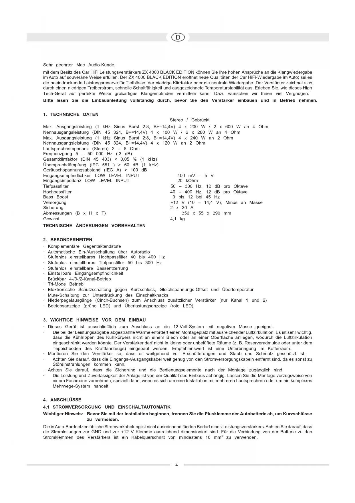 Sehr geehrter Mac Audio-Kunde, mit dem Besitz des Car HiFi Leistungsverstärkers ZX 4000 BLACK EDITION können Sie Ihre hohen Ansprüche an die Klangwiedergabe im Auto auf souveräne Weise erfüllen. Der ZX 4000 BLACK EDITION eröffnet neue Qualitäten der Car HiFi-Wiedergabe im Auto; sei es die beeindruckende Leistungsreserve für Tiefbässe, der niedrige Klirrfaktor oder die neutrale Wiedergabe. Der Verstärker zeichnet sich durch einen niedrigen Treiberstrom, schnelle Schaltfähigkeit und ausgezeichnete Temperaturstabilität aus. Erleben Sie, wie dieses High Tech-Gerät auf perfekte Weise großartiges Klangempfinden vermitteln kann. Dazu wünschen wir Ihnen viel Vergnügen. Bitte lesen Sie die Einbauanleitung vollständig durch, bevor Sie den Verstärker einbauen und in Betrieb nehmen.