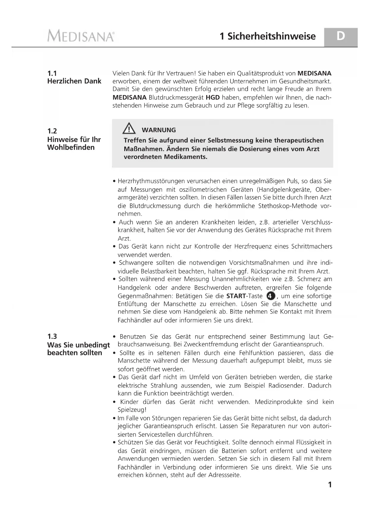 GA_HGD_10spr.qxd 05.12.2005 13:40 Uhr Seite 4Vielen Dank für Ihr Vertrauen! Sie haben ein Qualitätsprodukt von MEDISANA erworben, einem der weltweit führenden Unternehmen im Gesundheitsmarkt. Damit Sie den gewünschten Erfolg erzielen und recht lange Freude an Ihrem MEDISANA Blutdruckmessgerät HGD haben, empfehlen wir Ihnen, die nach- stehenden Hinweise zum Gebrauch und zur Pflege sorgfältig zu lesen. WARNUNG Treffen Sie aufgrund einer Selbstmessung keine therapeutischen Maßnahmen. Ändern Sie niemals die Dosierung eines vom Arzt verordneten Medikaments.
