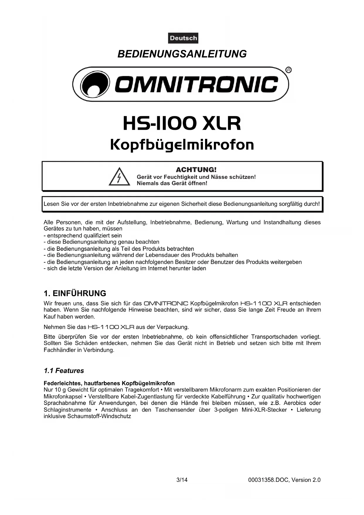 Wir freuen uns, dass Sie sich für das OMNITRONIC Kopfbügelmikrofon HS-1100 XLR entschieden haben. Wenn Sie nachfolgende Hinweise beachten, sind wir sicher, dass Sie lange Zeit Freude an IhremKauf haben werden.Nehmen Sie das HS-1100 XLR aus der Verpackung. Bitte überprüfen Sie vor der ersten Inbetriebnahme, ob kein offensichtlicher Transportschaden vorliegt. Sollten Sie Schäden entdecken, nehmen Sie das Gerät nicht in Betrieb und setzen sich bitte mit IhremFachhändler in Verbindung.