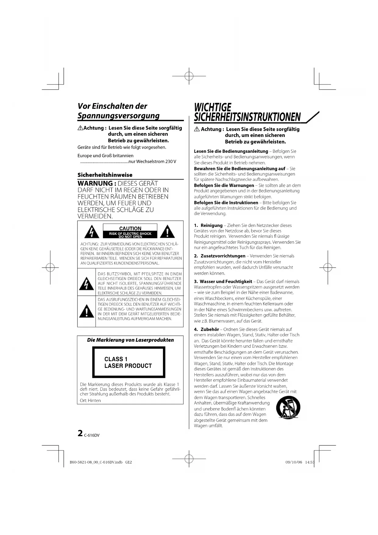 ¤ Achtung : Lesen Sie diese Seite sorgfältig durch, um einen sicheren Betrieb zu gewährleisten.Lesen Sie die Bedienungsanleitung – Befolgen Sie alle Sicherheits- und Bedienungsanweisungen, wenn Sie dieses Produkt in Betrieb nehmen.Bewahren Sie die Bedienungsanleitung auf – Sie sollten die Sicherheits- und Bedienungsanweisungen für spätere Nachschlagzwecke aufbewahren.Befolgen Sie die Warnungen – Sie sollten alle an dem Produkt angegebenen und in der Bedienungsanleitung aufgeführten Warnungen strikt befolgen.Befolgen Sie die Instruktionen – Bitte befolgen Sie alle aufgeführten Instruktionen für die Bedienung und die Verwendung.1. Reinigung – Ziehen Sie den Netzstecker dieses Gerätes von der Netzdose ab, bevor Sie dieses Produkt reinigen. Verwenden Sie niemals fl üssige Reinigungsmittel oder Reinigungssprays. Verwenden Sie nur ein angefeuchtetes Tuch für das Reinigen.2. Zusatzvorrichtungen – Verwenden Sie niemals Zusatzvorrichtungen, die nicht vom Hersteller empfohlen wurden, weil dadurch Unfälle verursacht werden können.3. Wasser und Feuchtigkeit – Das Gerät darf niemals Wassertropfen oder Wasserspritzern ausgesetzt werden – wie sie zum Beispiel in der Nähe einer Badewanne, eines Waschbeckens, einer Küchenspüle, einer Waschmaschine, in einem feuchten Kellerraum oder in der Nähe eines Schwimmbeckens usw. auftreten. Stellen Sie niemals mit Flüssigkeiten gefüllte Behälter, wie z.B. Blumenvasen, auf das Gerät.4. Zubehör – Ordnen Sie dieses Gerät niemals auf einem instabilen Wagen, Stand, Stativ, Halter oder Tisch an. Das Gerät könnte herunter fallen und ernsthafte Verletzungen bei Kindern und Erwachsenen bzw. ernsthafte Beschädigungen an dem Gerät verursachen. Verwenden Sie nur einen vom Hersteller empfohlenen Wagen, Stand, Stativ, Halter oder Tisch. Die Montage dieses Gerätes ist gemäß den Instruktionen des Herstellers auszuführen, wobei nur das von dem Hersteller empfohlene Einbaumaterial verwendet werden darf. Lassen Sie äußerste Vorsicht walten, wenn Sie das auf einen Wagen angebrachte Gerät mit dem Wagen transportieren. Schnelles Anhalten, übermäßige Kraftanwendung und unebene Bodenfl ächen könnten dazu führen, dass das auf dem Wagen abgestellte Gerät gemeinsam mit dem Wagen umfällt.CAUTIONRISK OF ELECTRIC SHOCKDO NOT OPENACHTUNG: ZUR VERMEIDUNG VON ELEKTRISCHEN SCHLÄ-GEN KEINE GEHÄUSETEILE (ODER DIE RÜCKWAND) ENT-FERNEN. IM INNERN BEFINDEN SICH KEINE VOM BENUTZER REPARIERBAREN TEILE. WENDEN SIE SICH FÜR REPARATUREN AN QUALIFIZIERTES KUNDENDIENSTPERSONAL.DAS BLITZSYMBOL MIT PFEILSPITZE IN EINEM GLEICHSEITIGEN DREIECK SOLL DEN BENUTZER AUF NICHT ISOLIERTE, SPANNUNGSFÜHRENDE TEILE INNERHALB DES GEHÄUSES HINWEISEN, UM ELEKTRISCHE SCHLÄGE ZU VERMEIDEN.DAS AUSRUFUNGSZEICHEN IN EINEM GLEICHSEI-TIGEN DREIECK SOLL DEN BENUTZER AUF WICHTI-GE BEDIENUNG- UND WARTUNGSANWEISUNGEN IN DER MIT DEM GERÄT MITGELIEFERTEN BEDIE-NUNGSANLEITUNG AUFMERKSAM MACHEN. B60-5821-0800C-616DV.indbGE2B60-5821-0800C-616DV.indbGE2 09/10/0614:5309/10/0614:53Deutsch