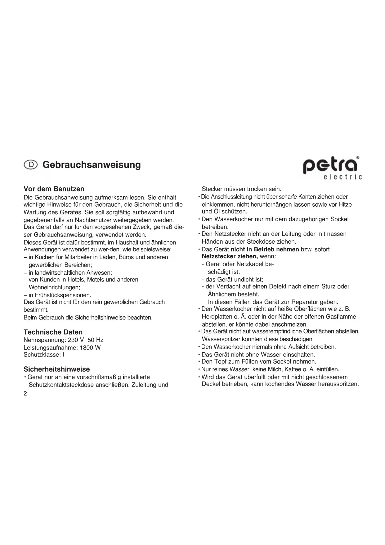 WK 186.00 - Wasserkocher Petra Electric - Kostenlose Bedienungsanleitung