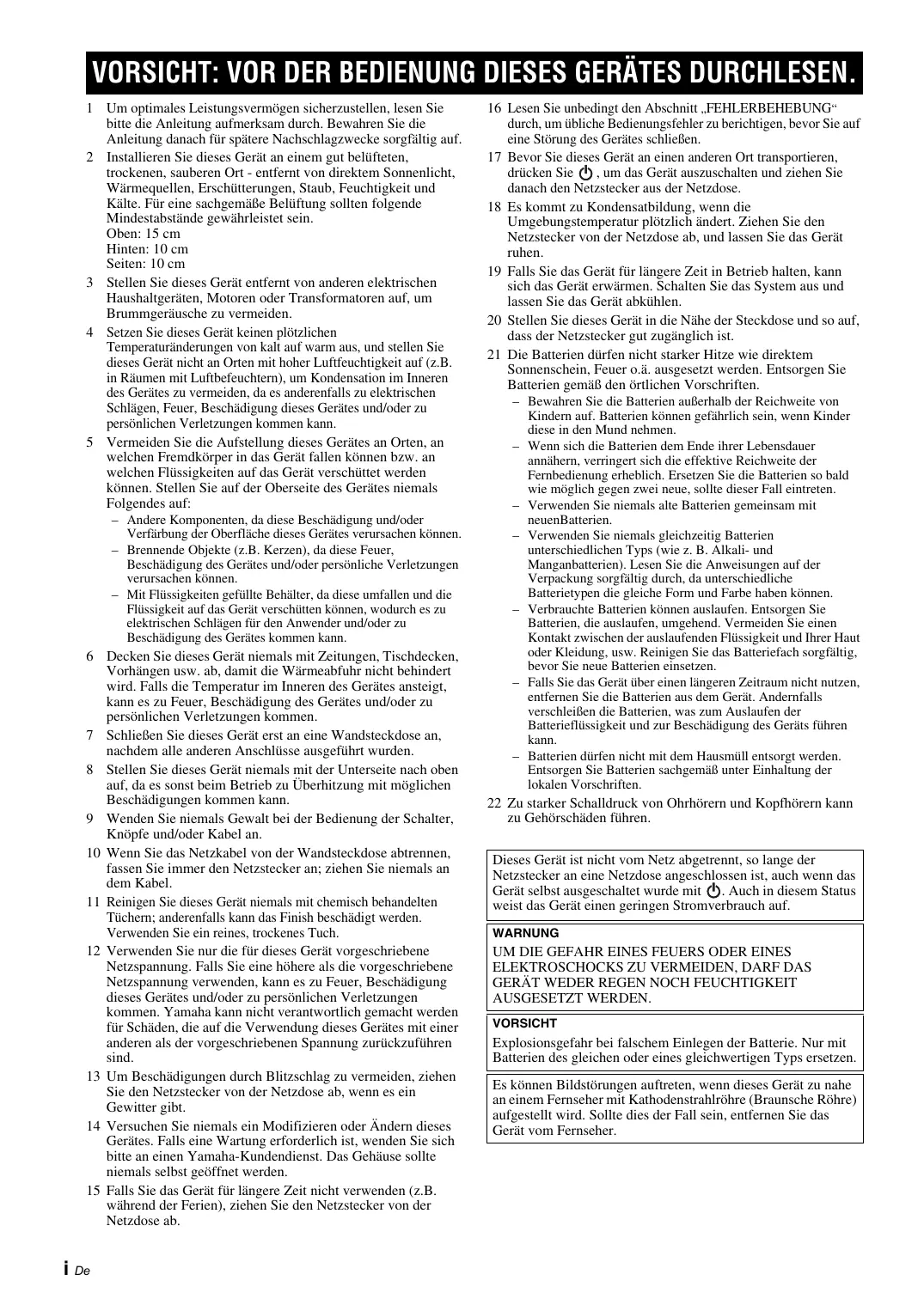 - Bluetooth ist ein eingetragenes Warenzeichen von Bluetooth SIG und wird von Yamaha im Rahmen einer Lizenzvereinbarung verwendet. Dieses Gerät enthält einen Laser. Um unnötige Augenverletzungen zu vermeiden, sollten Sie alle Wartungs- und Reparaturarbeiten einem qualifizierten Wartungstechniker überlassen. GEFAHR Sichtbare Laserstrahlen bei geöffneter Abdeckung. Achten Sie darauf, nicht direkt in den Laserstrahl zu blicken. Wenn dieses Gerät an der Steckdose angeschlossen ist, schauen Sie nicht durch den CD-Schacht oder andere Öffnungen in das Innere des Geräts.